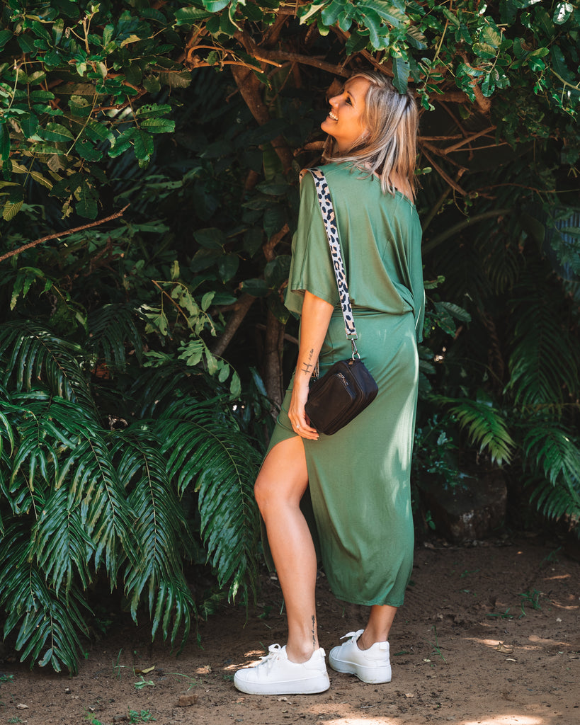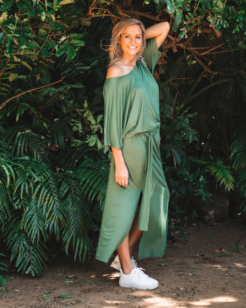 Beautiful viscose spandex maxi dress with elastic in the hip and self belt, wear on or off the shoulder.