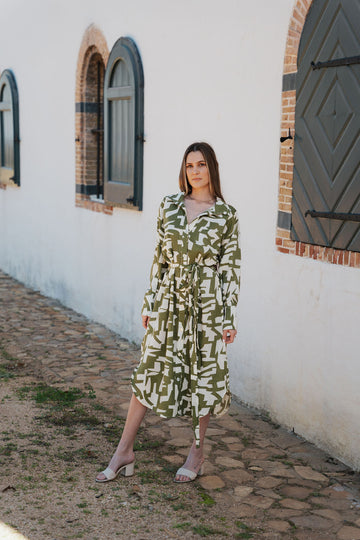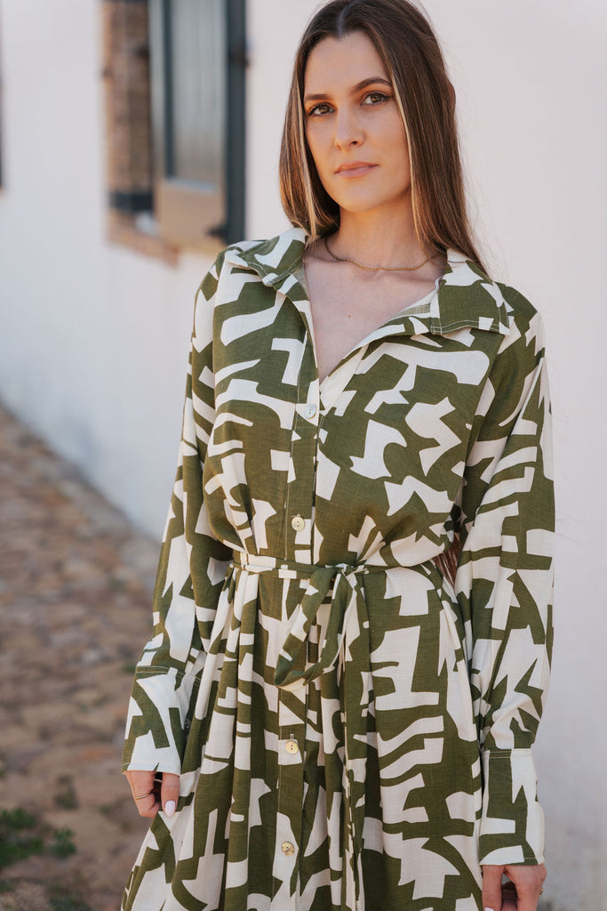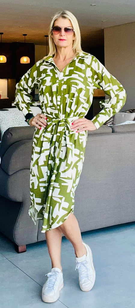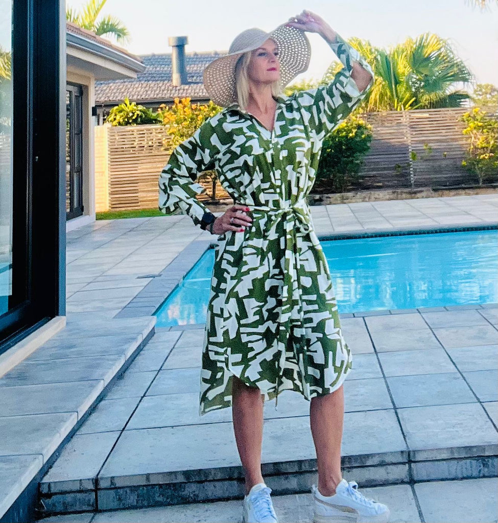 This button though shirt dress with shell buttons and collar and self fabric belt.
