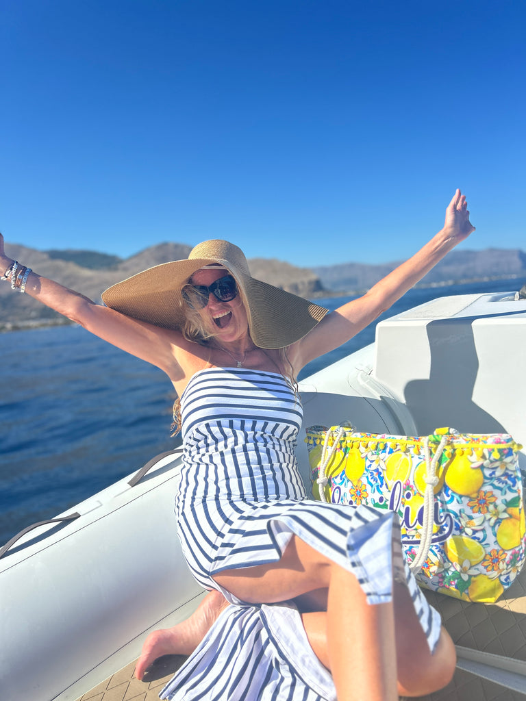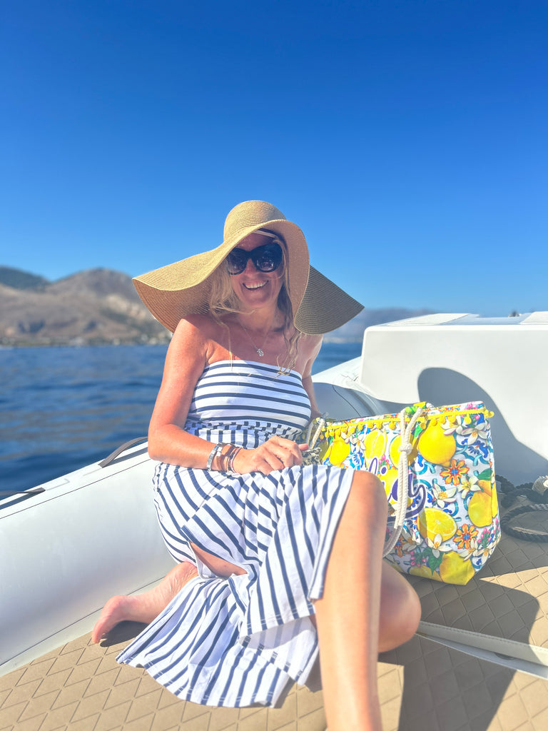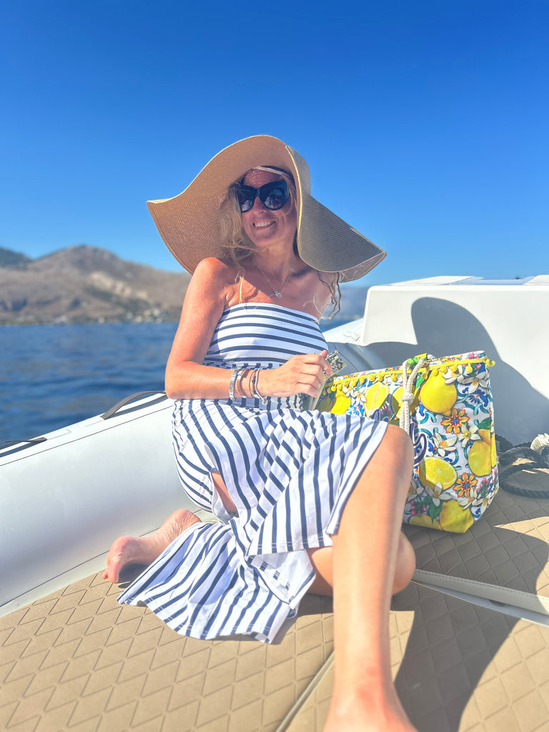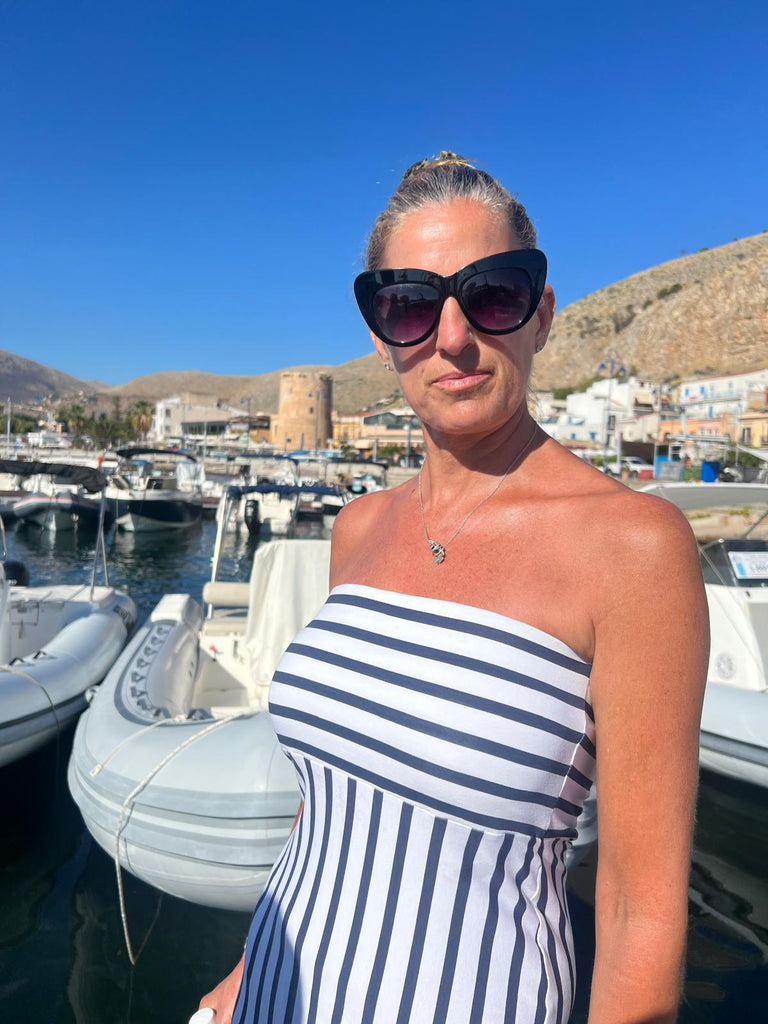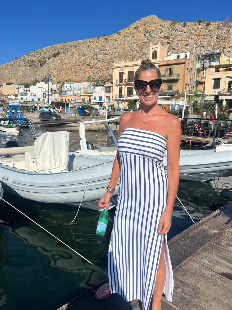 This boobtube nautical stripe dress is made in cotton lycra, the stripe running horizontal on the bust and vertical on the body to give you a slim look.