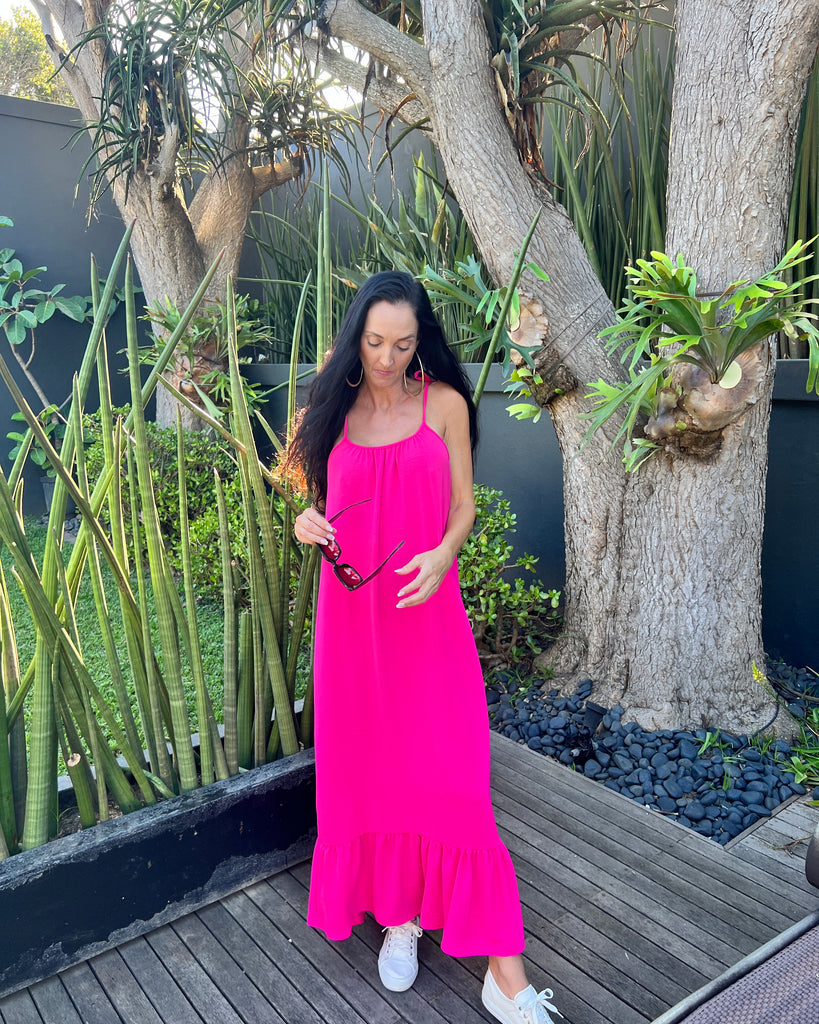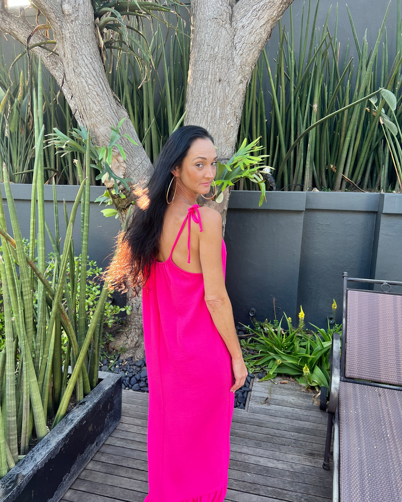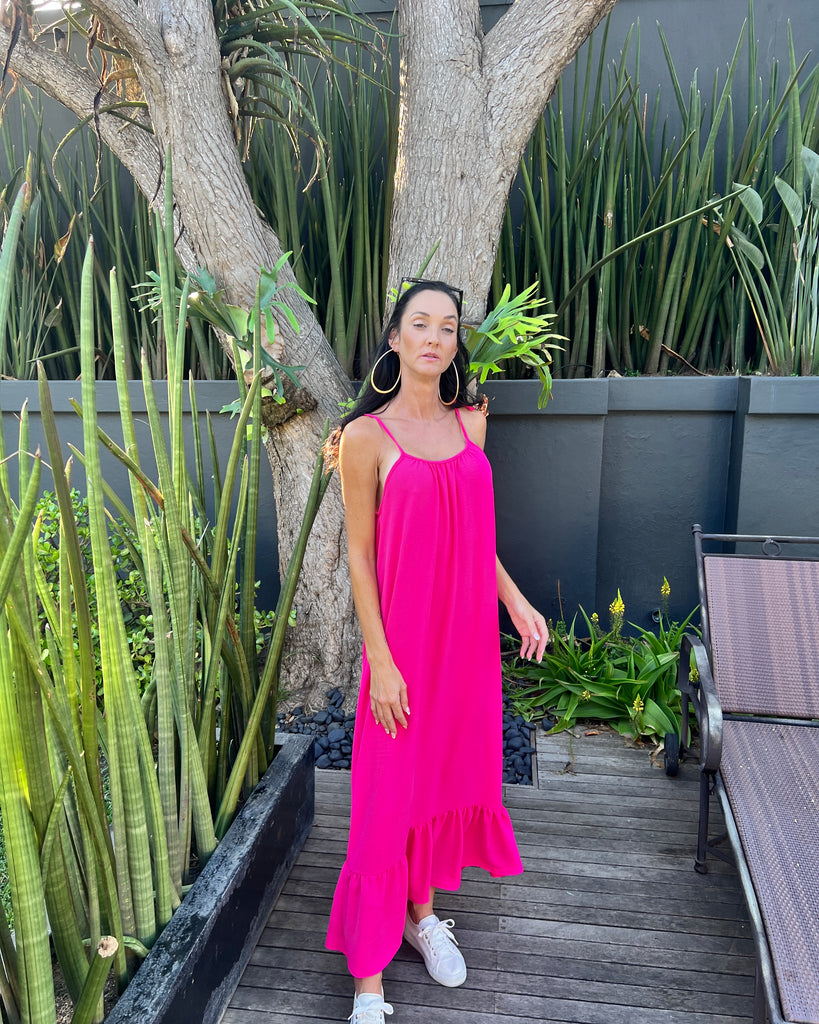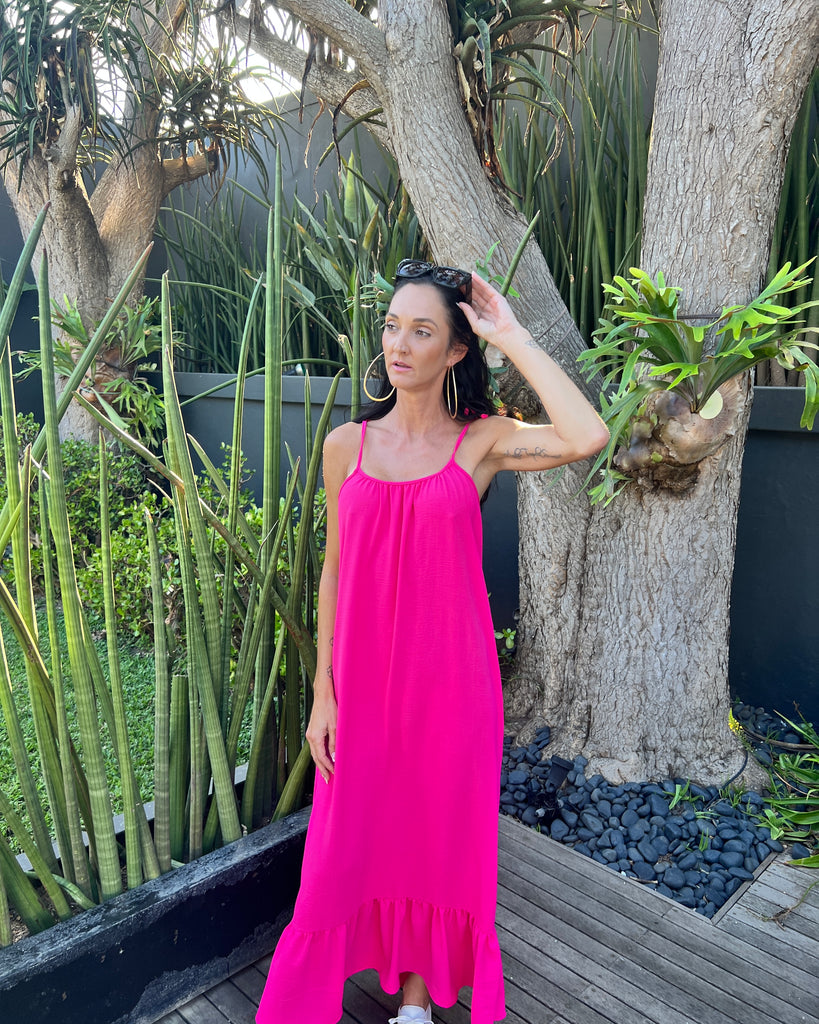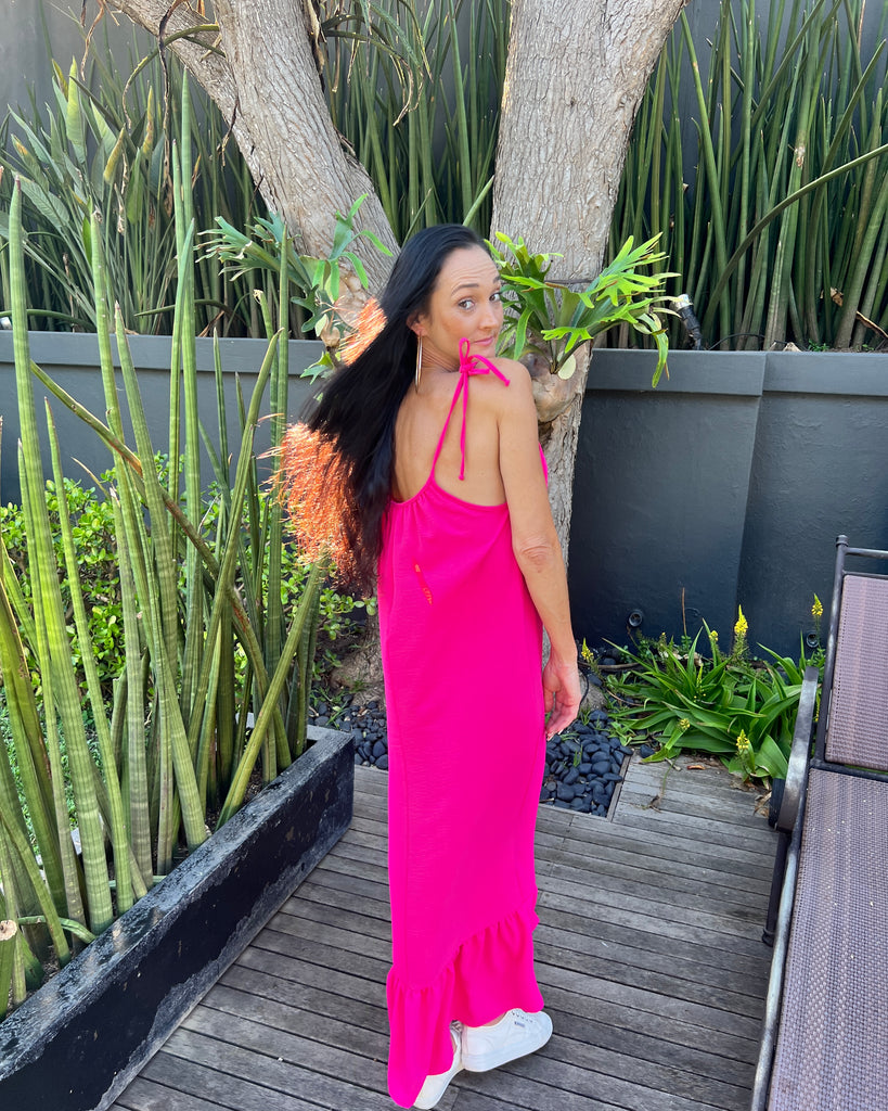 This striking maxi dress with a bottom frill and adjustable ties.