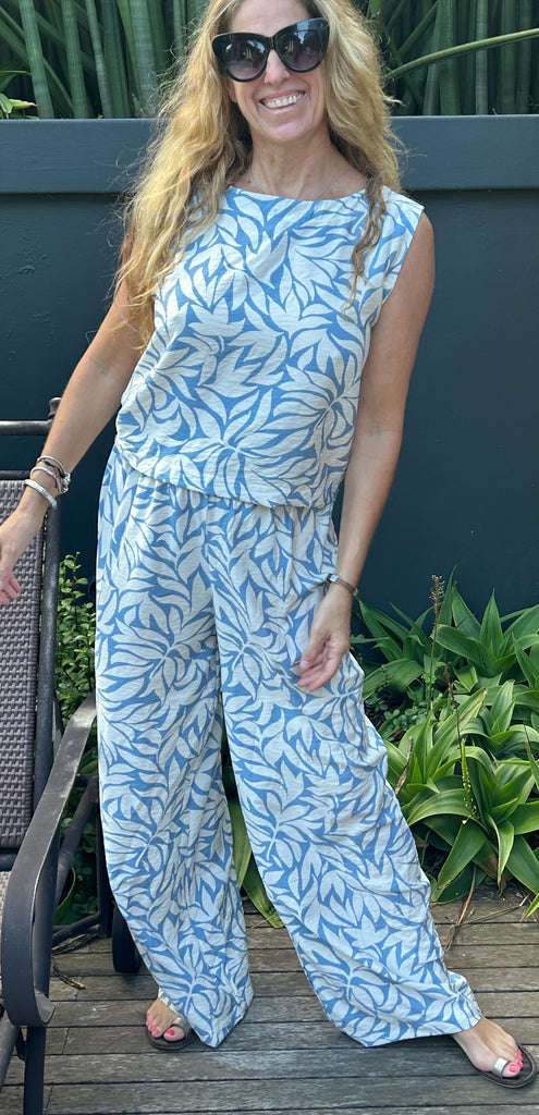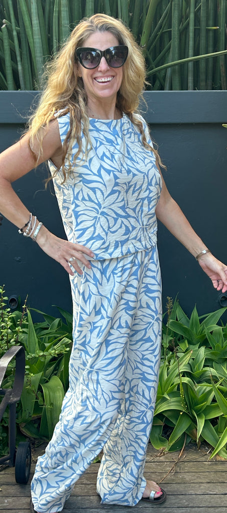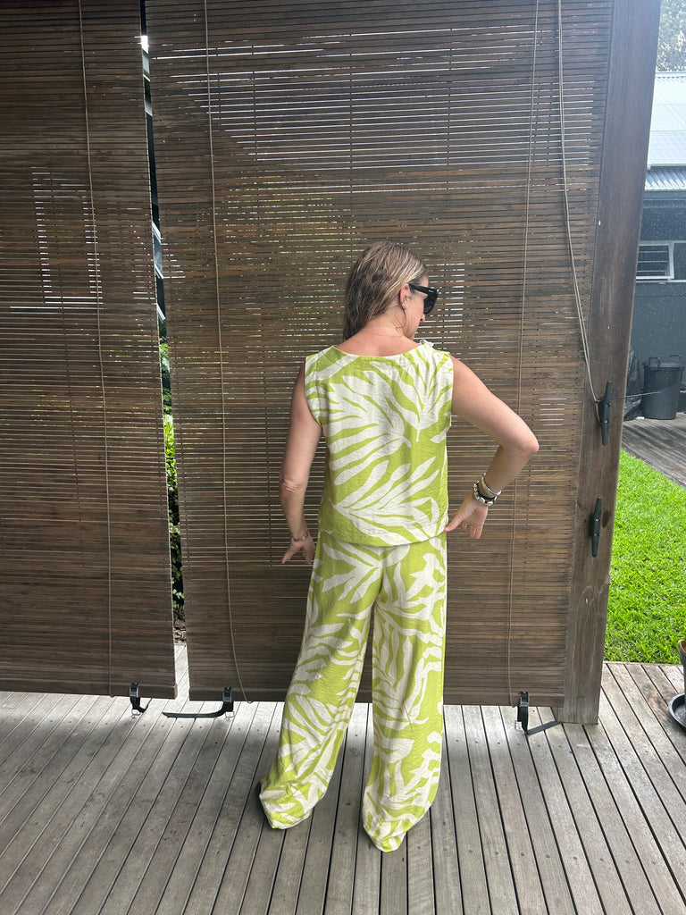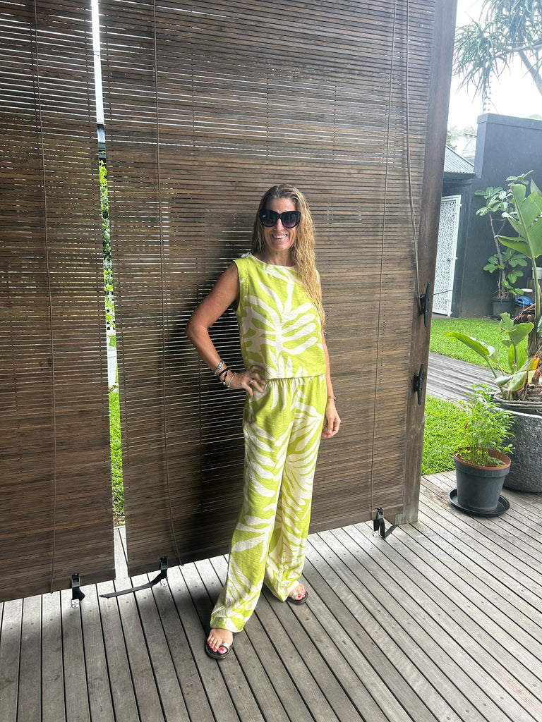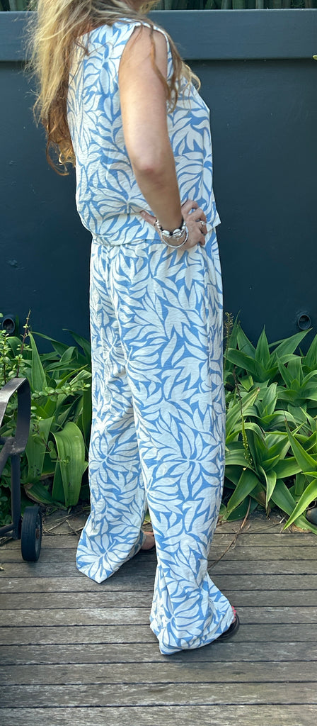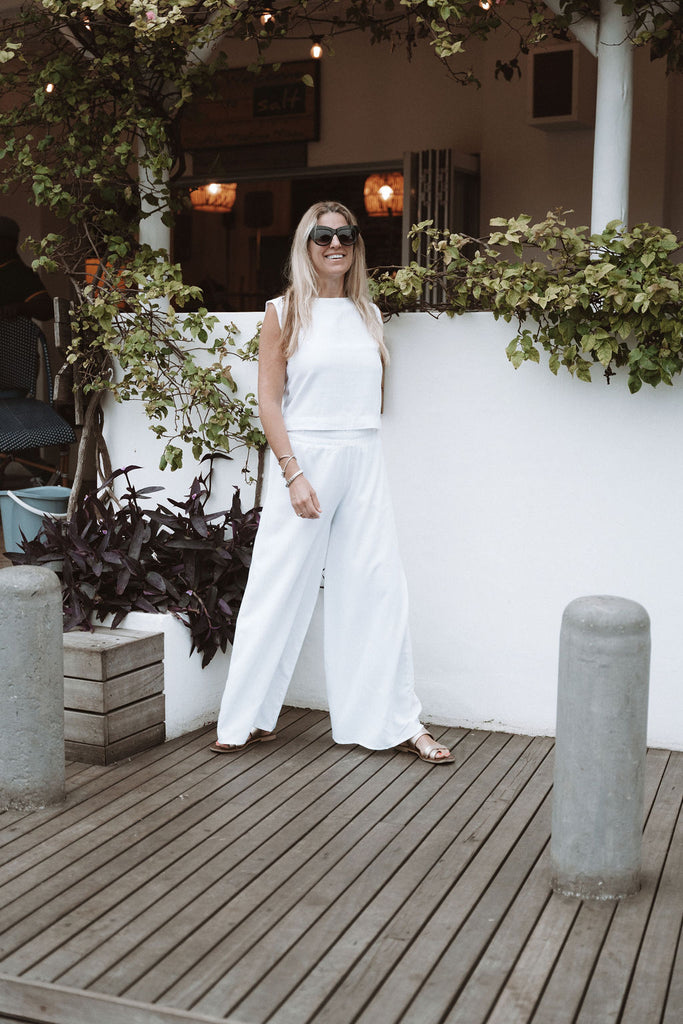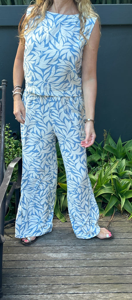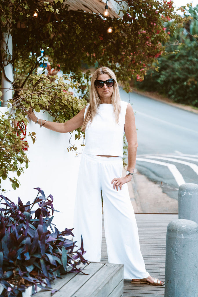 Wide leg linen pants with elasticated waist and top with wide facing and stitch detail .