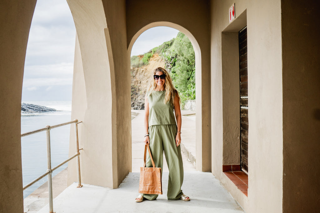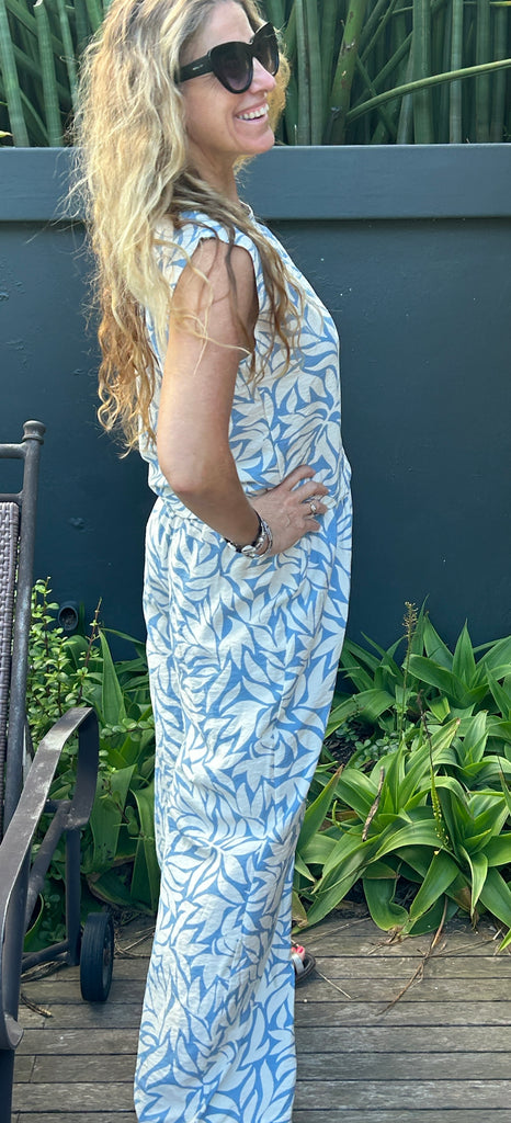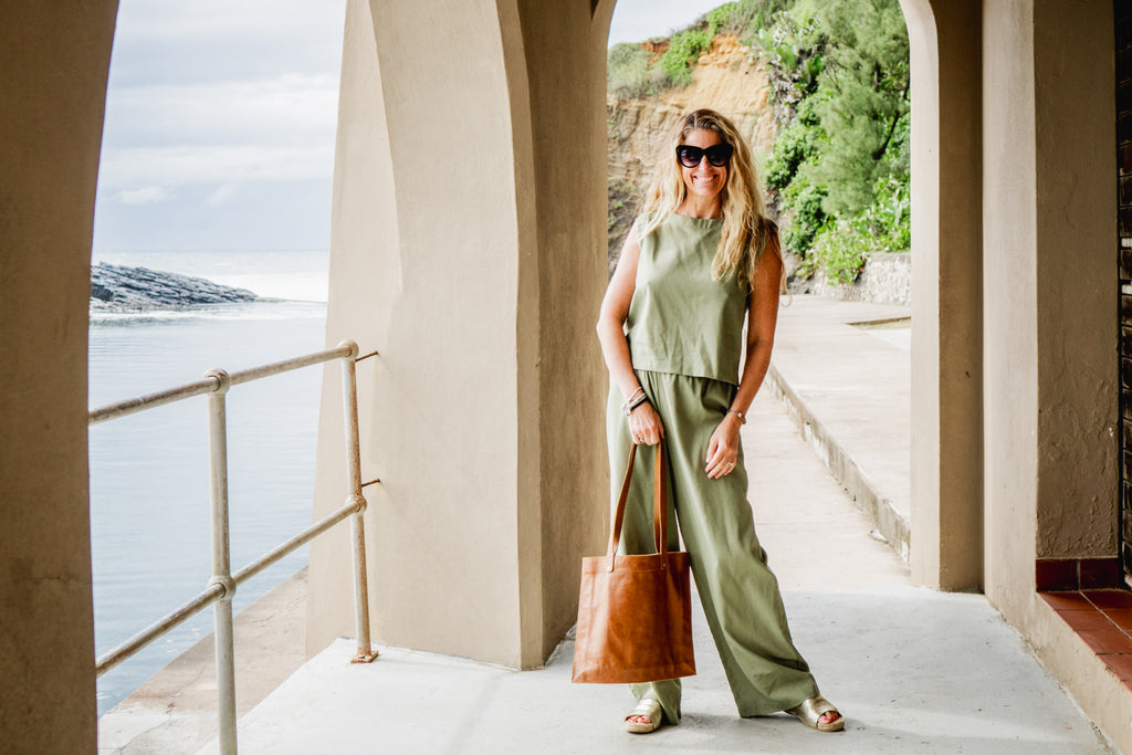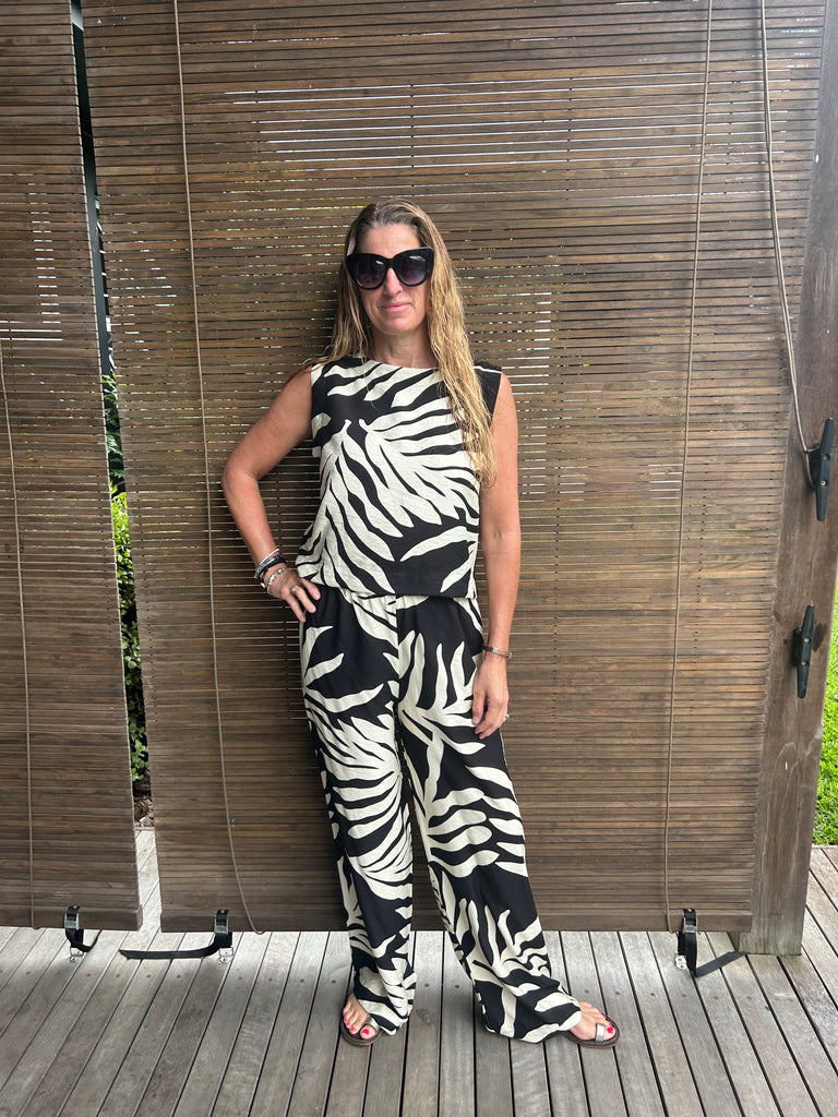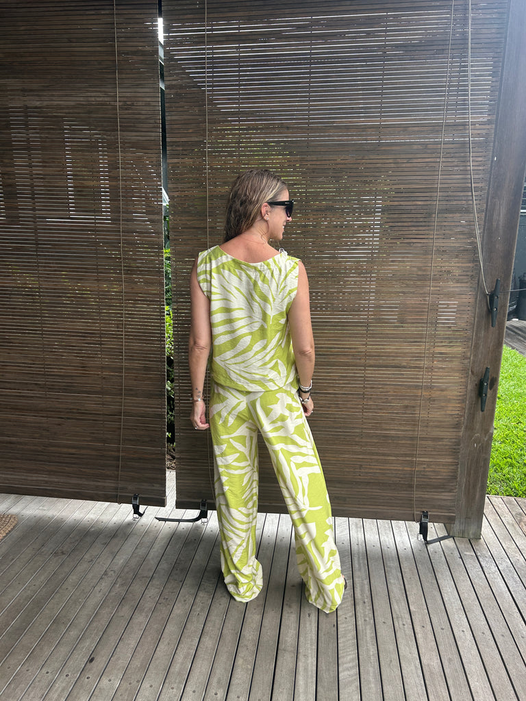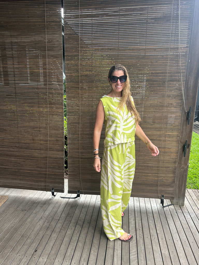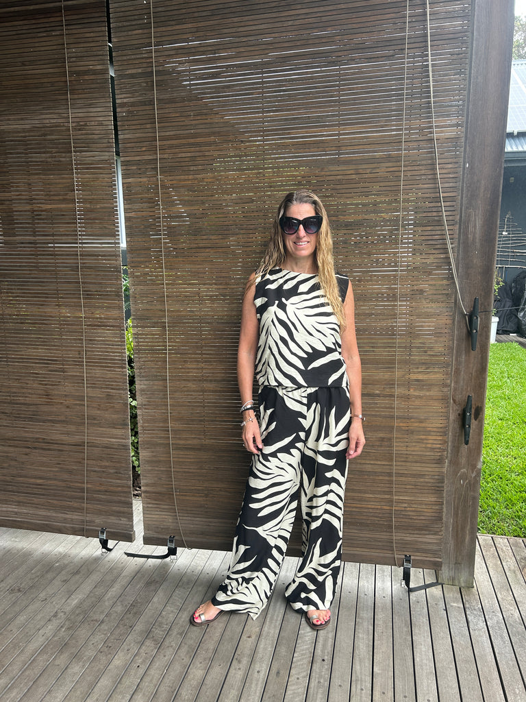 Wide leg linen pants with elasticated waist and top with wide facing and stitch detail .
