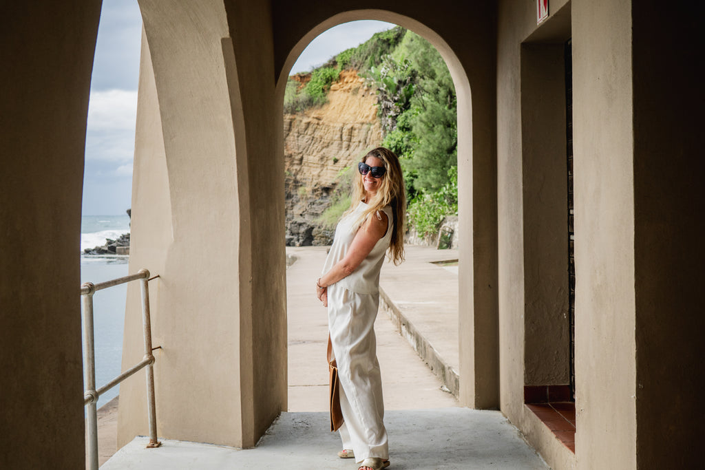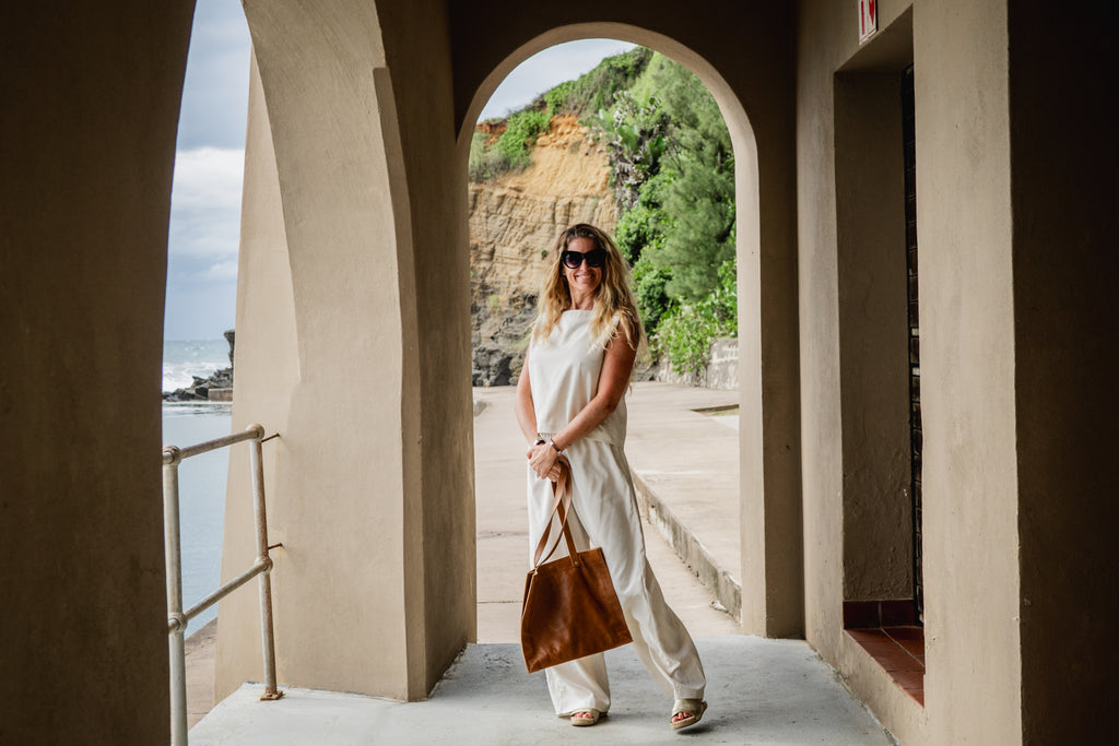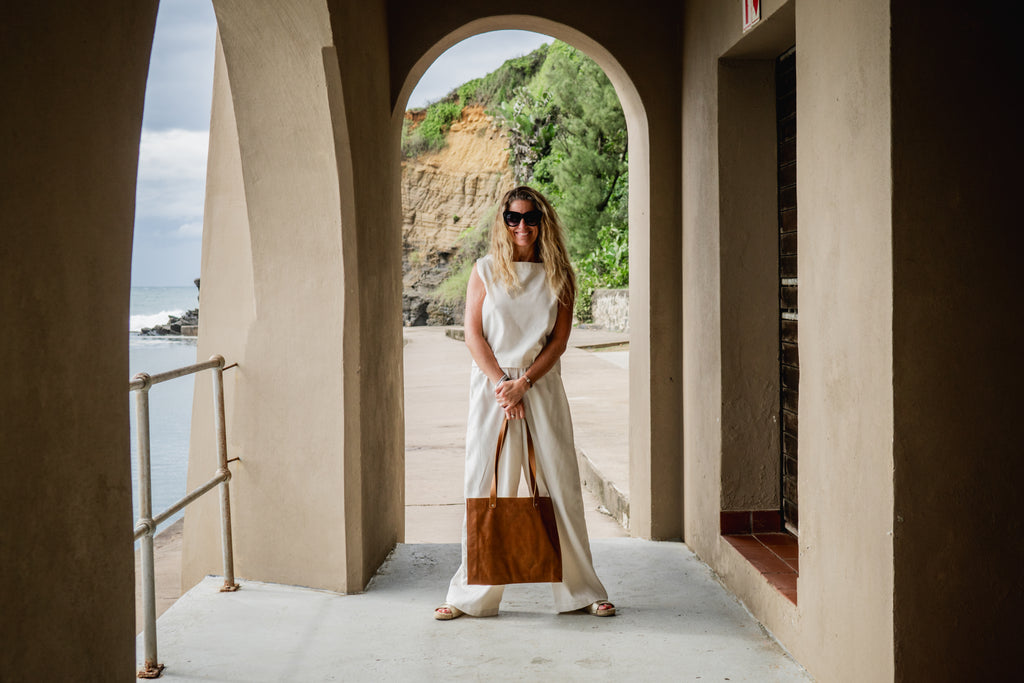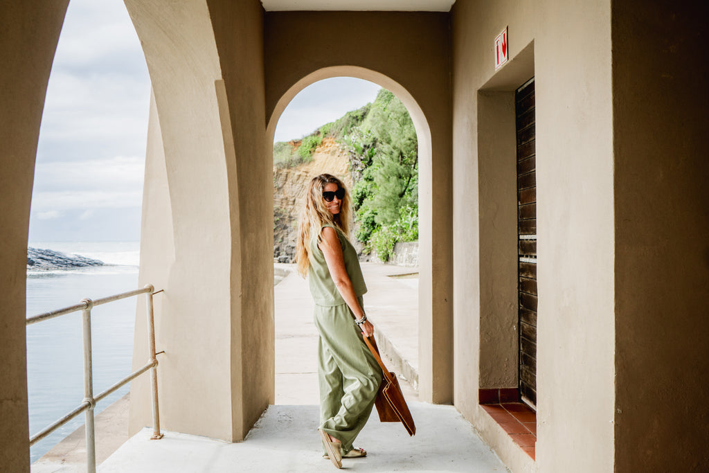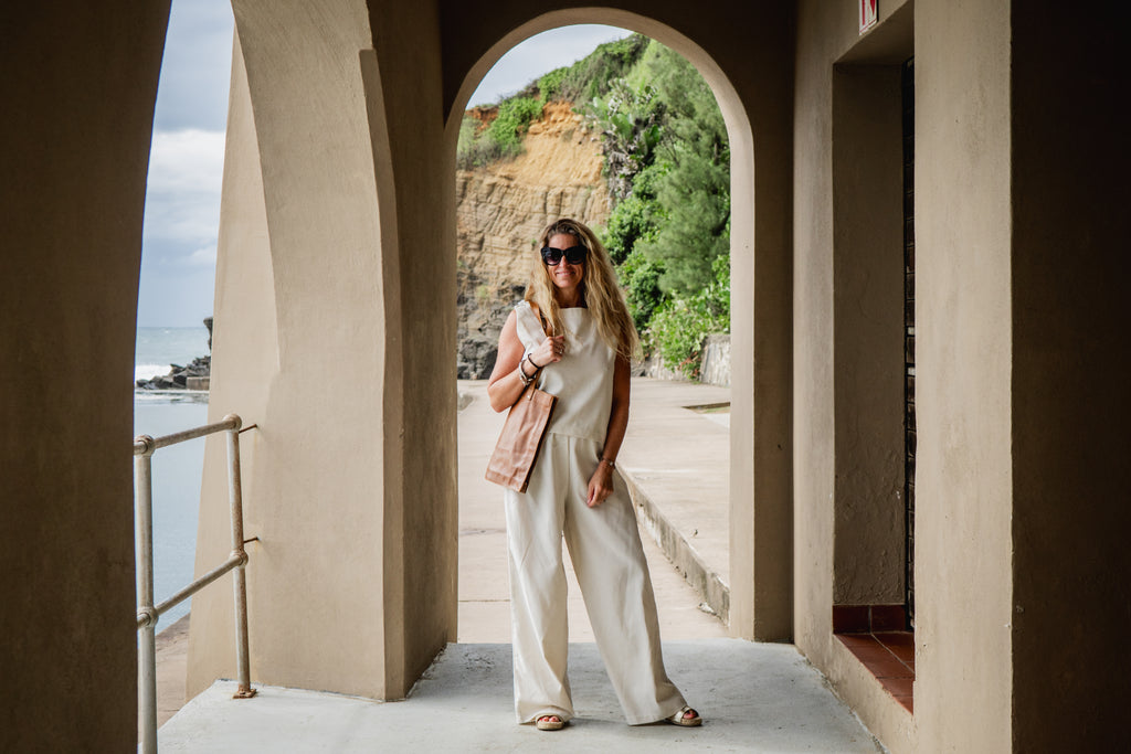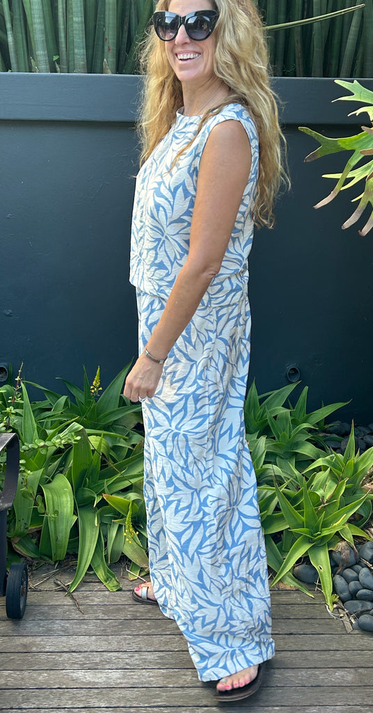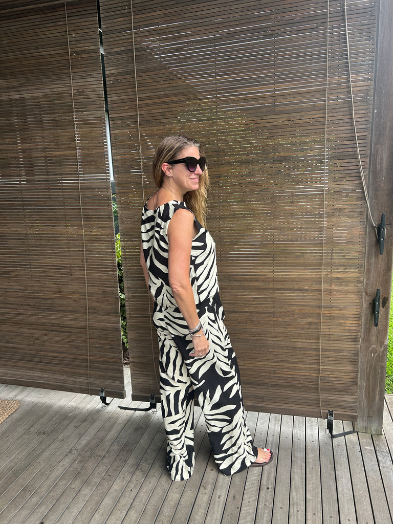 Wide leg linen pants with elasticated waist and top with wide facing and stitch detail .