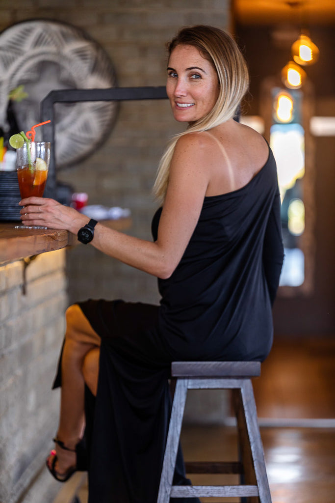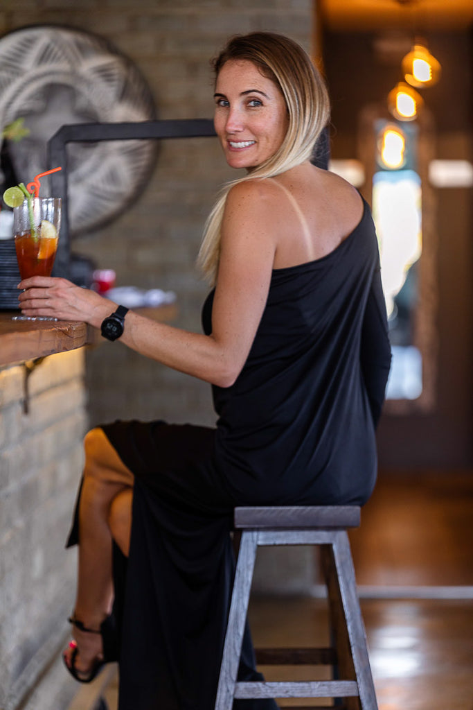 This beautiful flattering dress has one long sleeve and is off the shoulder. What a show stopper at any event. Beautiful draped bon-bon knit with bust lining so no need to wear a bra.