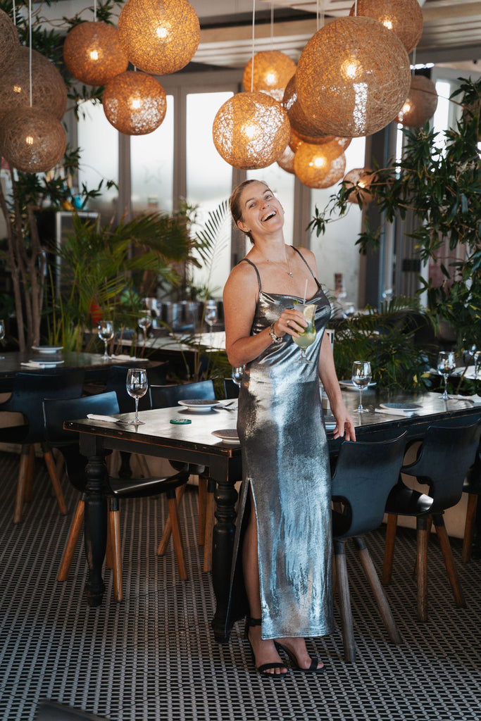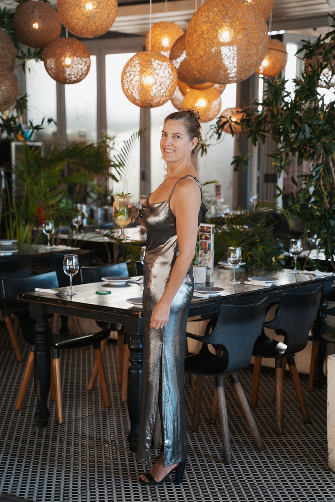 We love this versatile stylish easy to slip on dress. Adjustable bra straps, cowl neck front and straight back with side slits.
