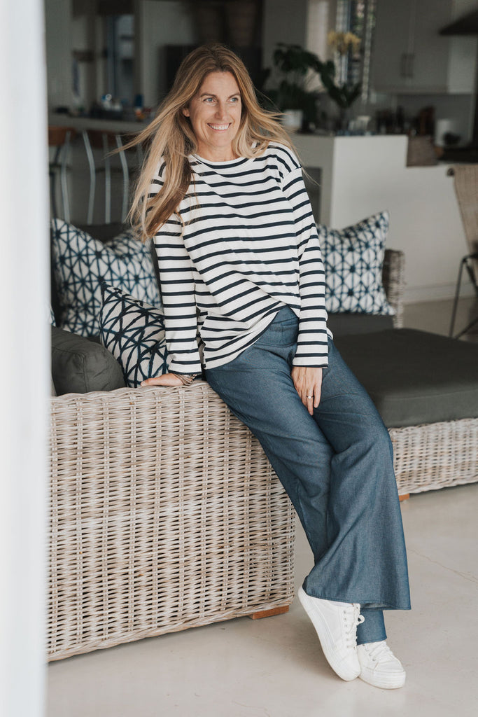 We love the quality of this yarndye stripe. Stunning neck line with long sleeves and a spacious fit. Yarndye stripes are super flattering and bang on trend.
