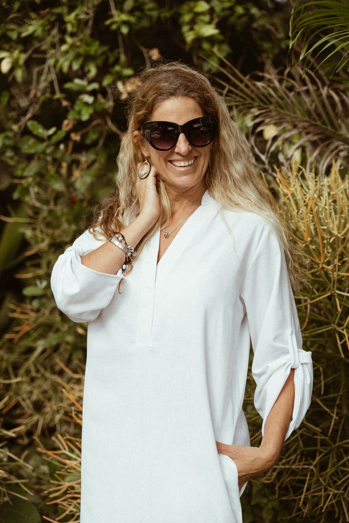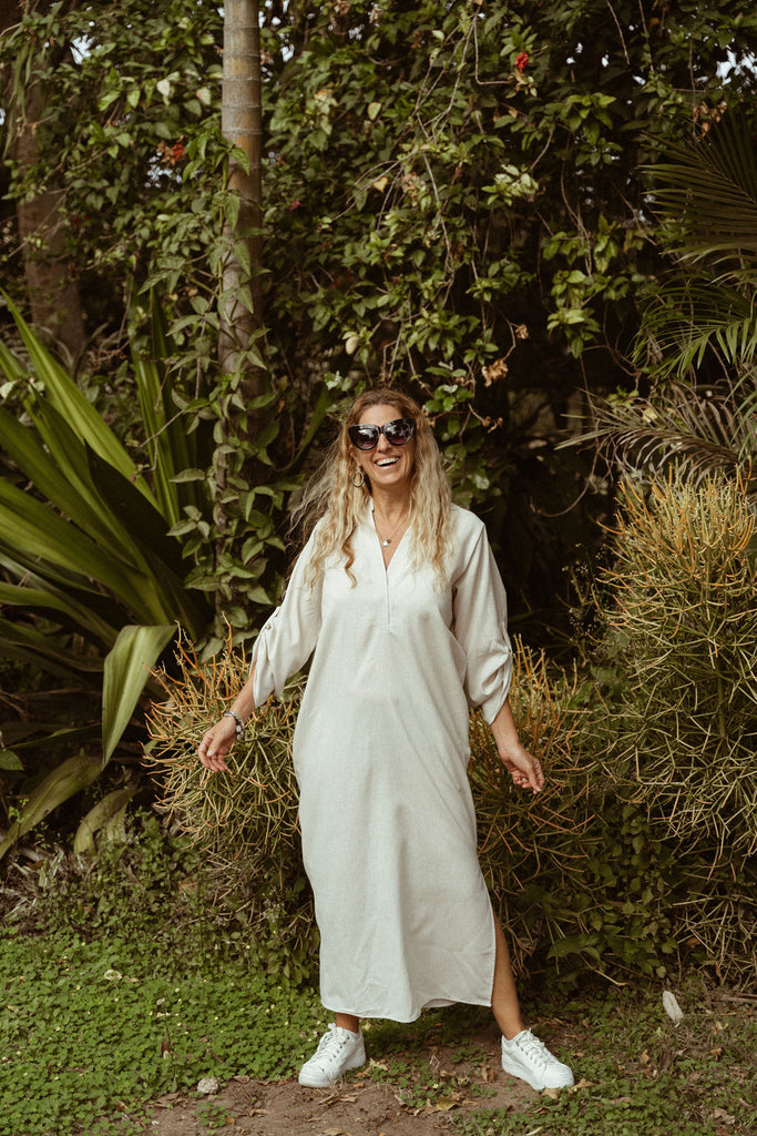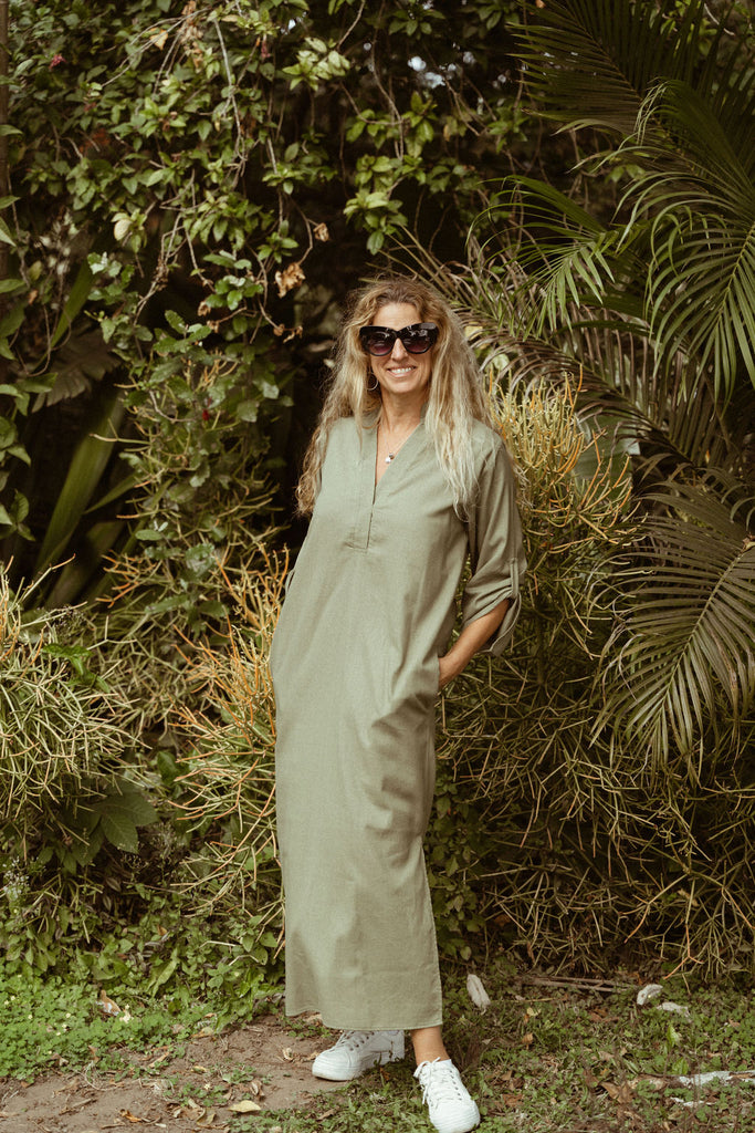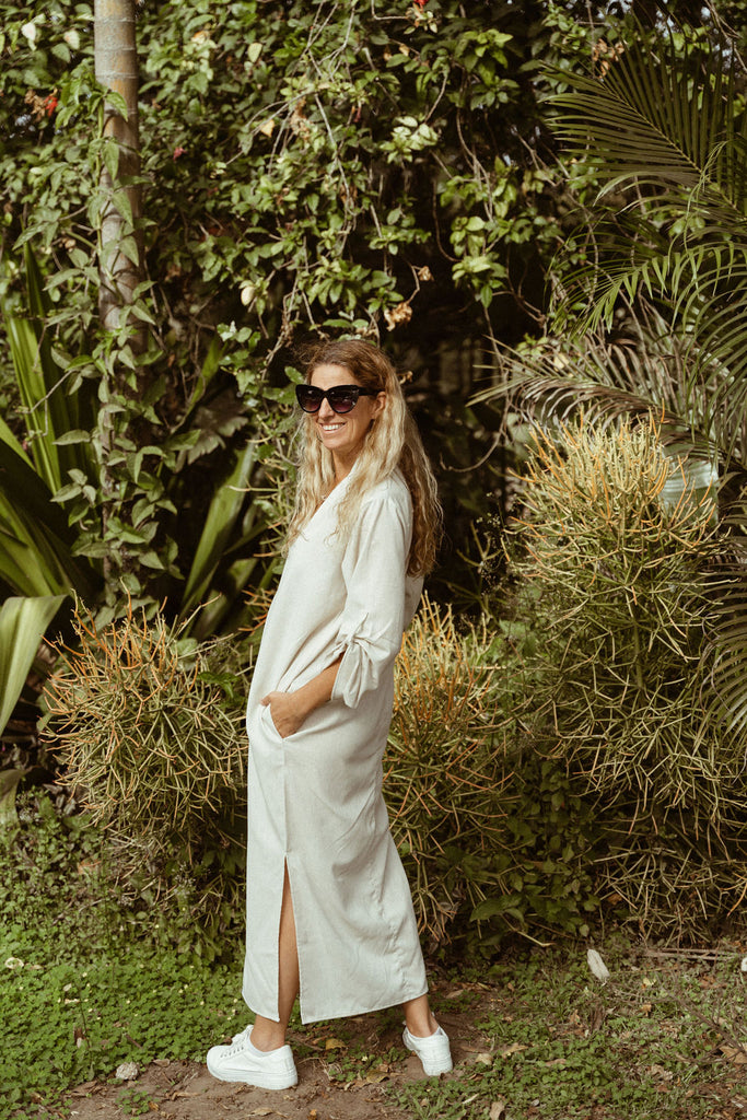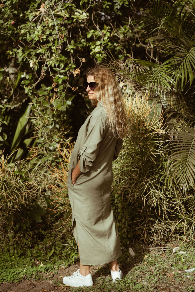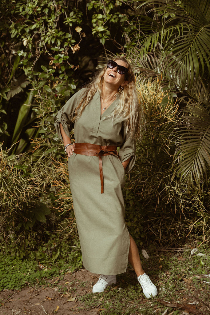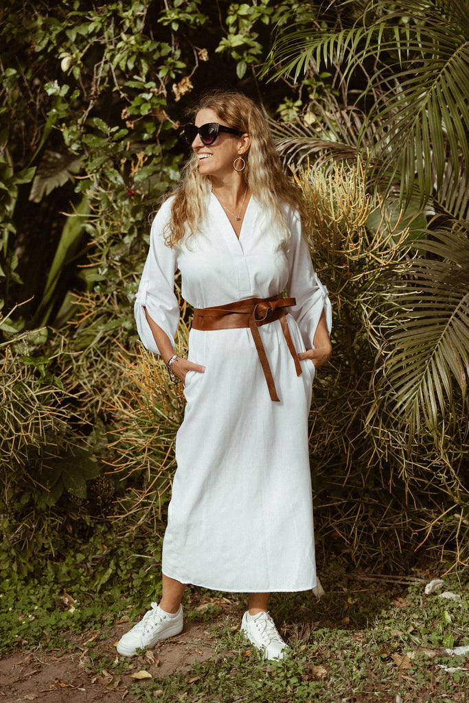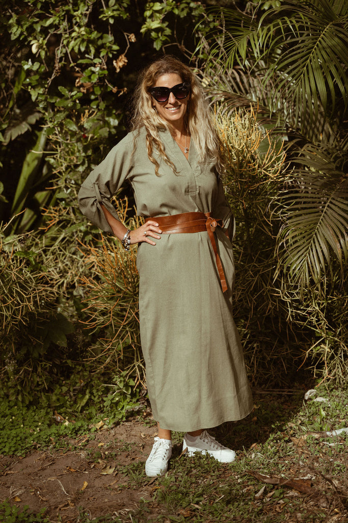 Stunning linen flory dress with tabs on the sleeves, pockets and slits on the sides, pair with leather belt.