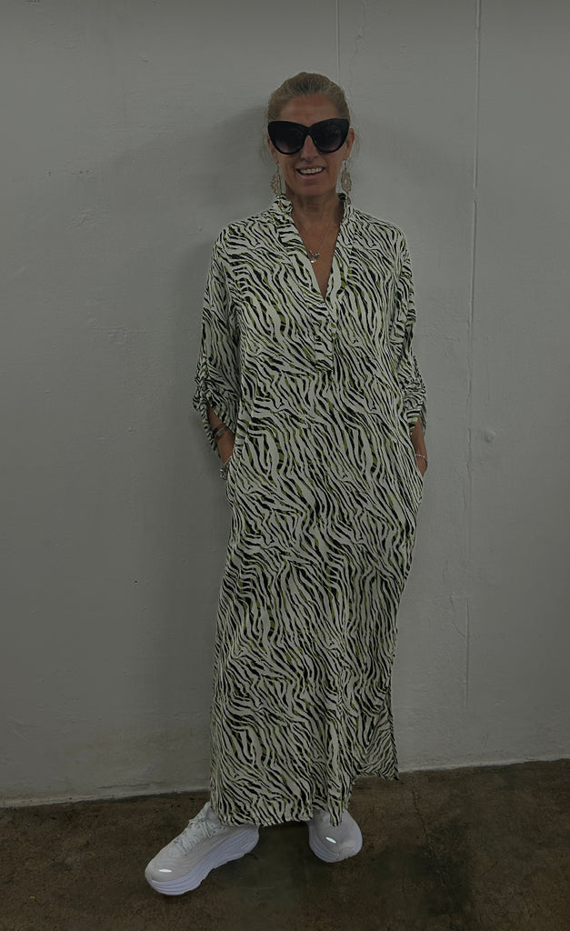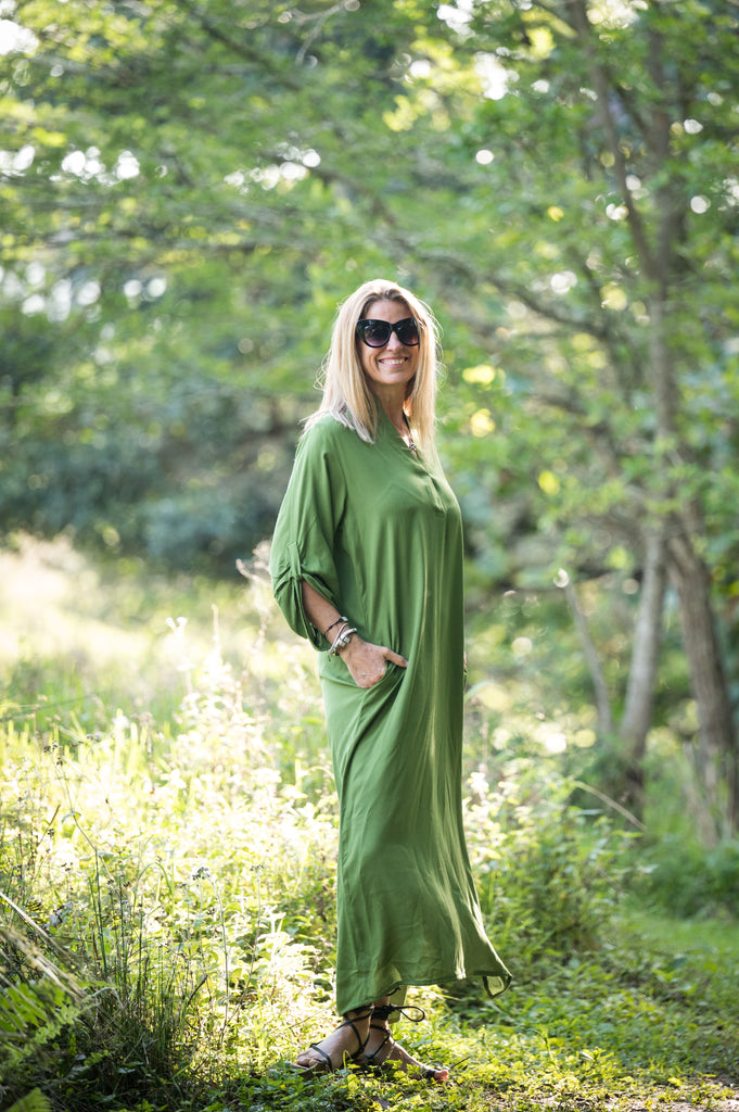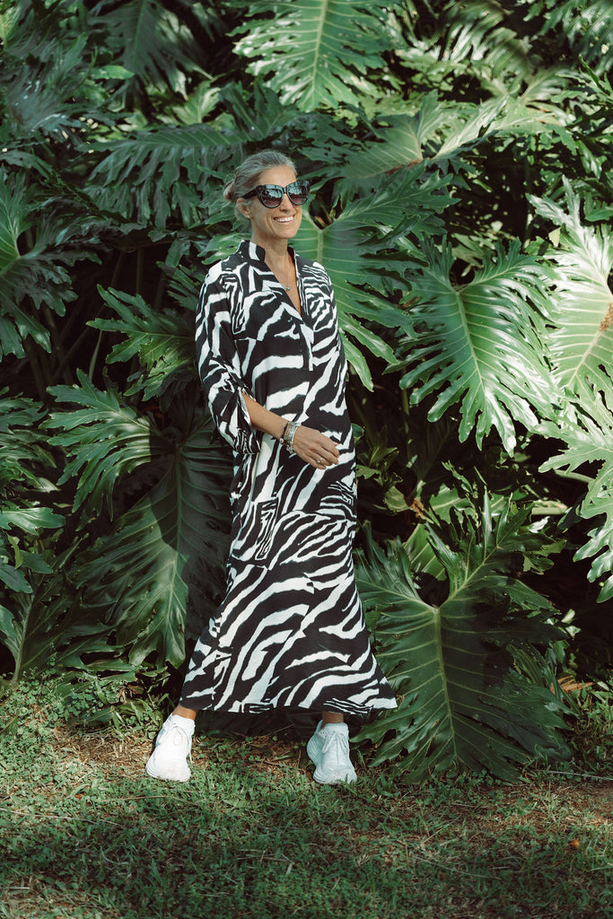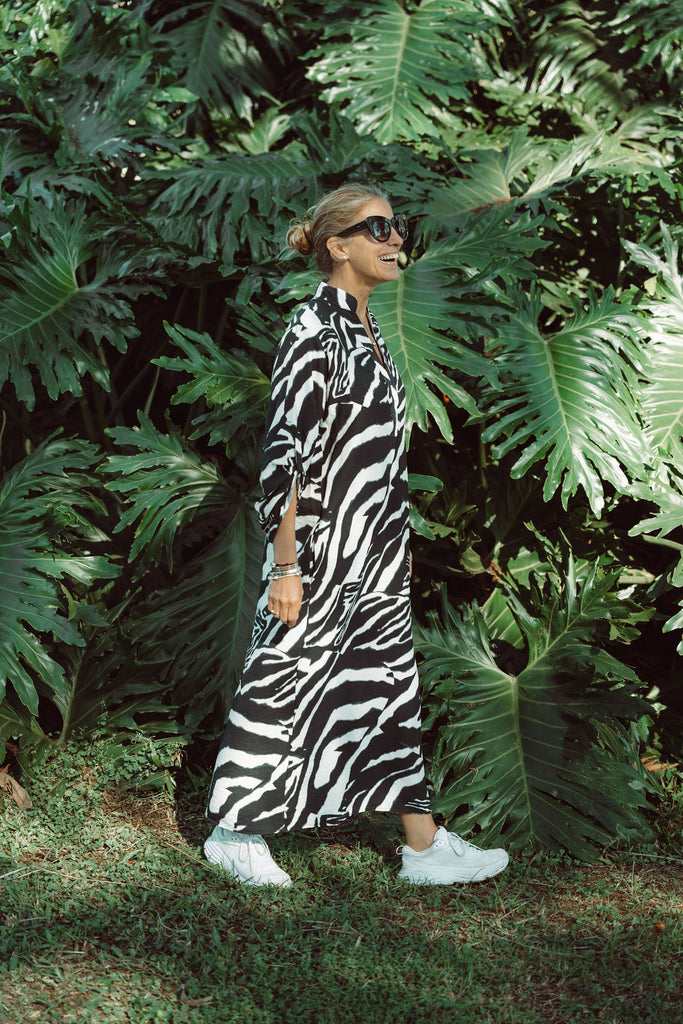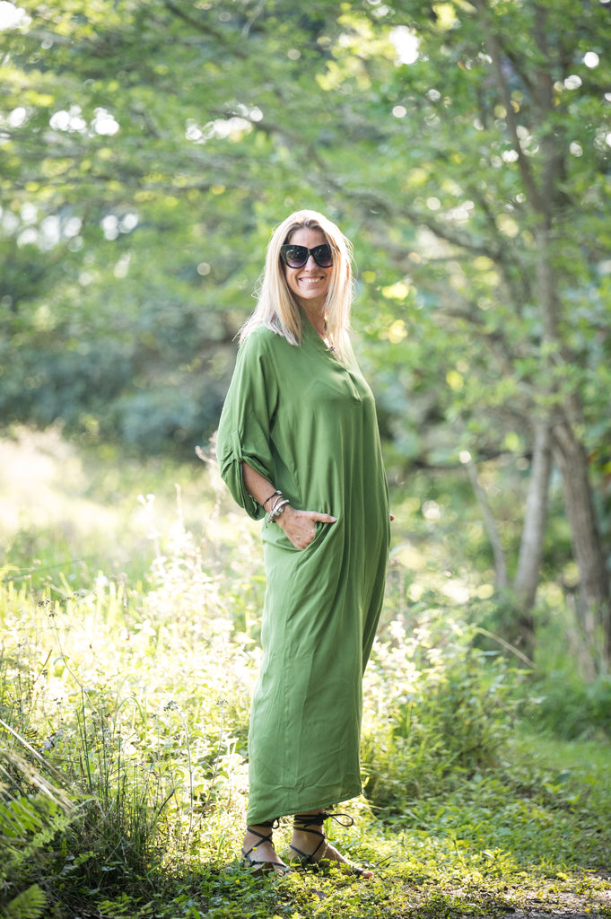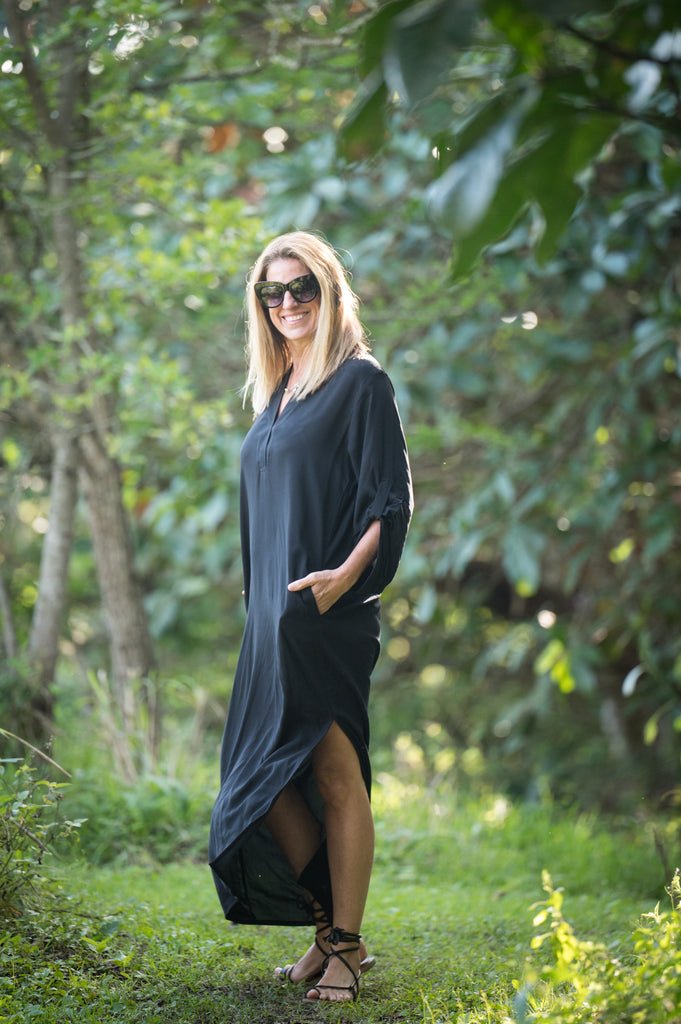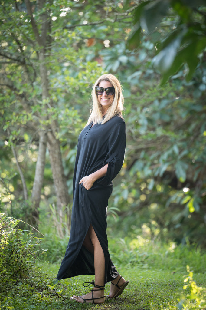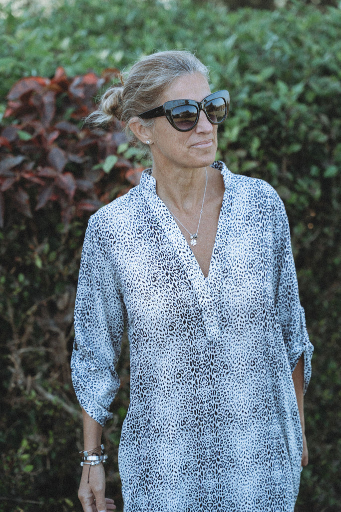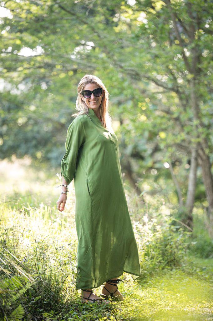 We love Flory, a shirt dress with a mandarin collar and placket, tab on the sleeve and one slit.