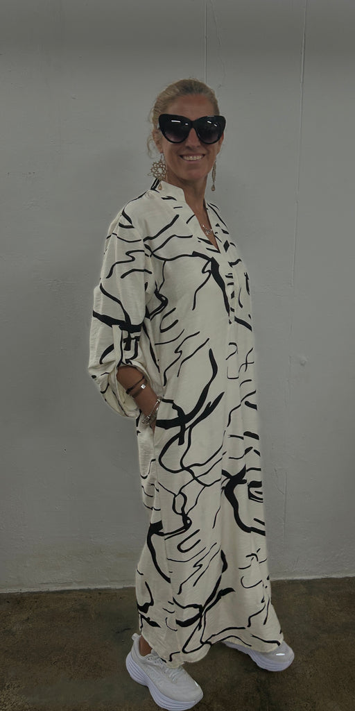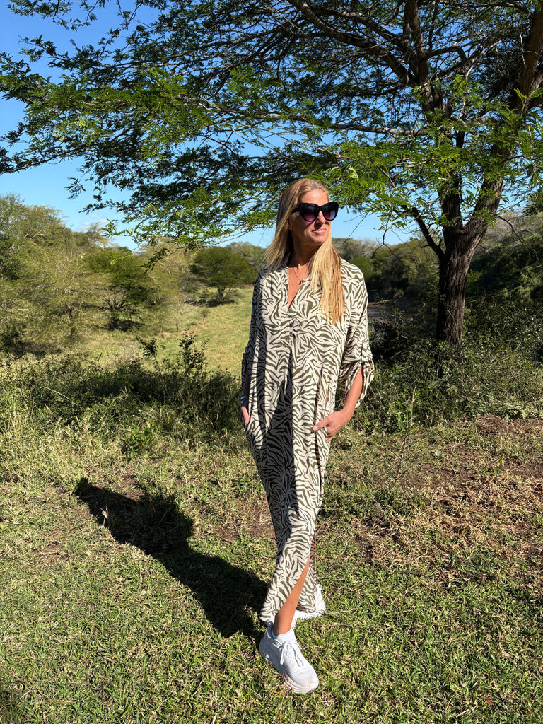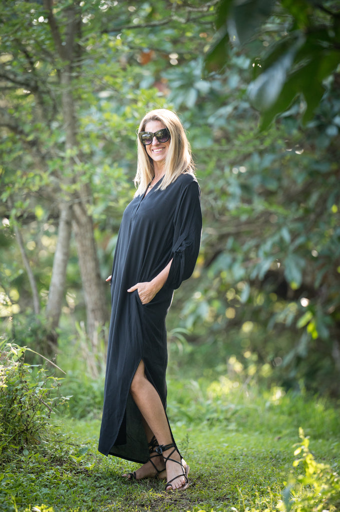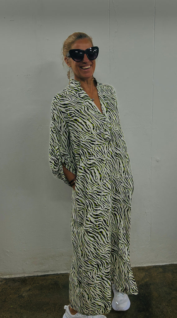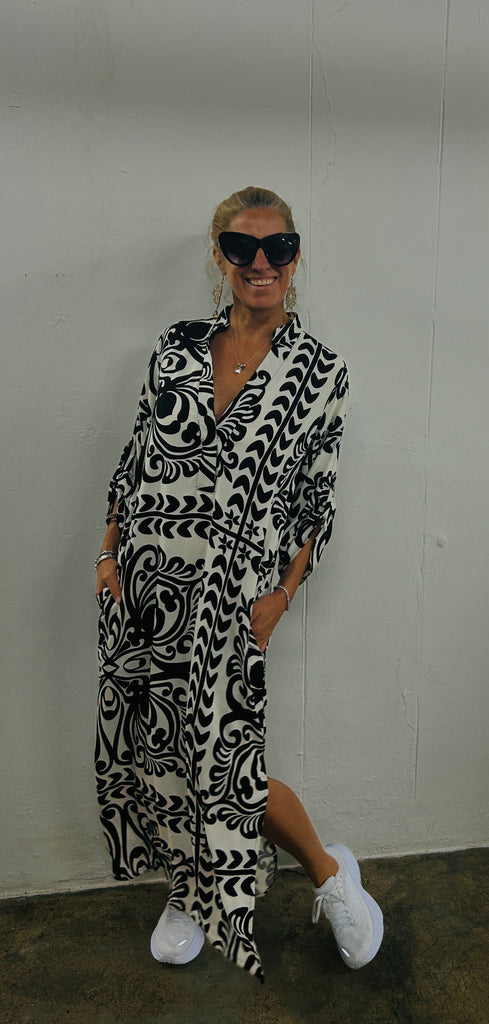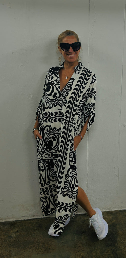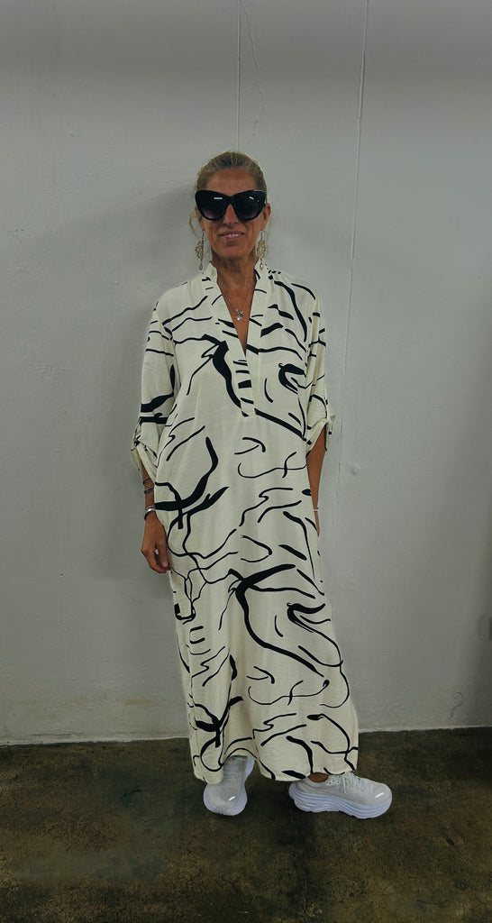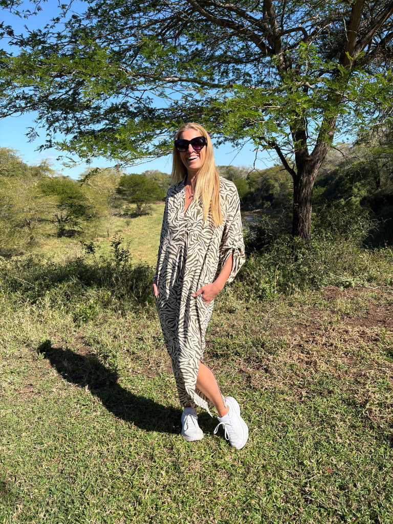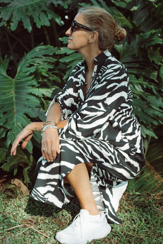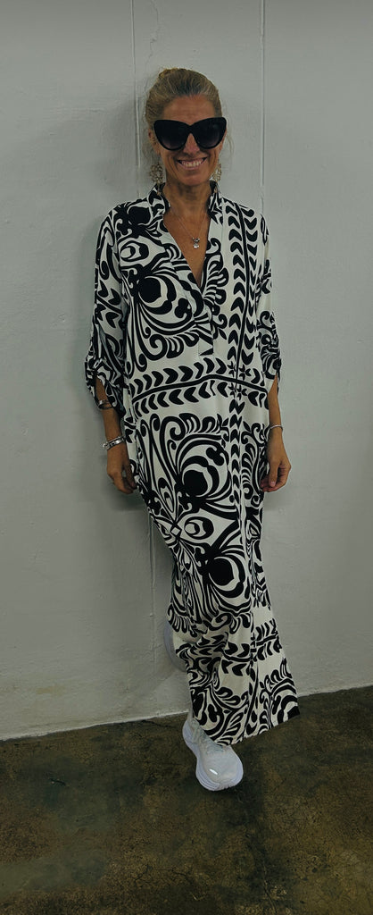 We love Flory, a shirt dress with a mandarin collar and placket, tab on the sleeve and one slit.