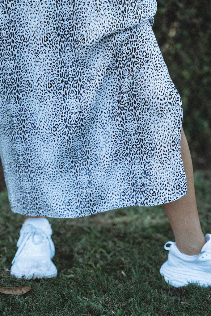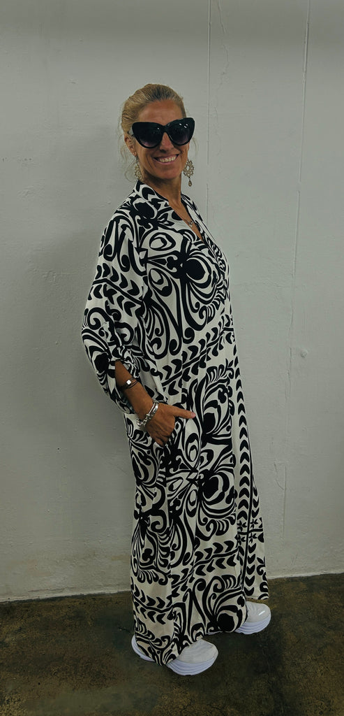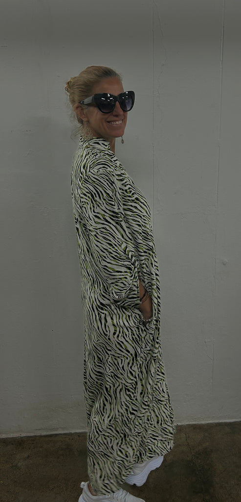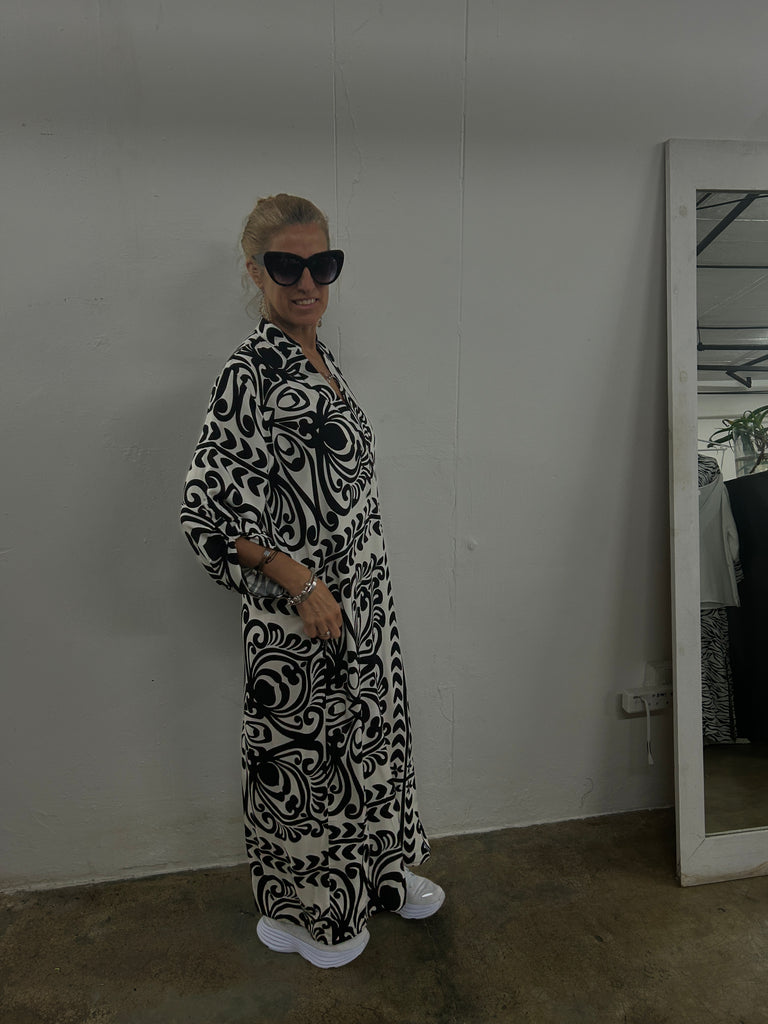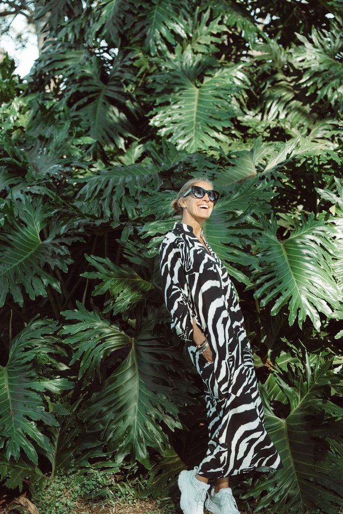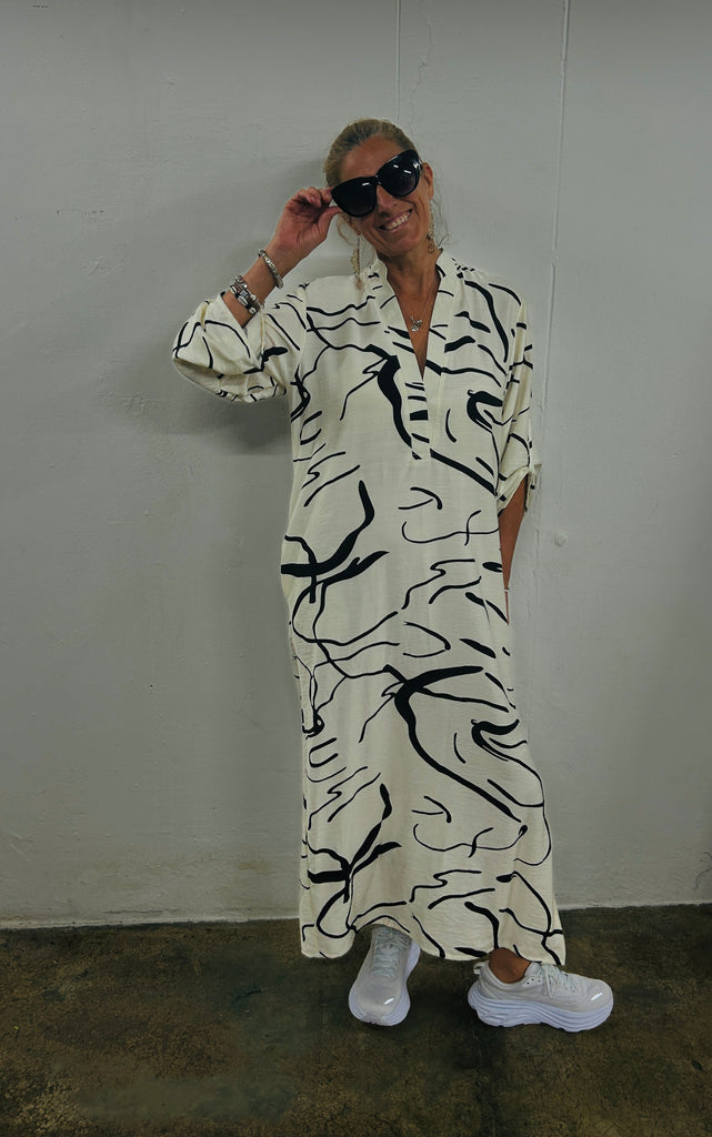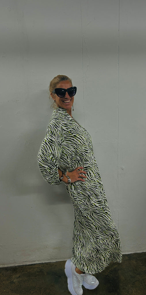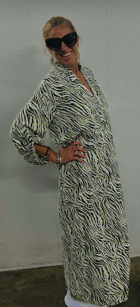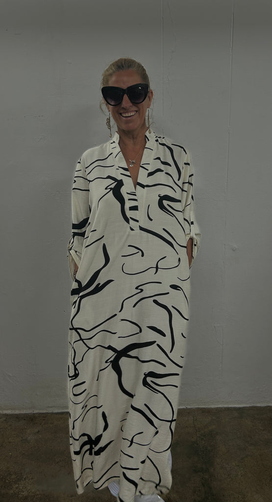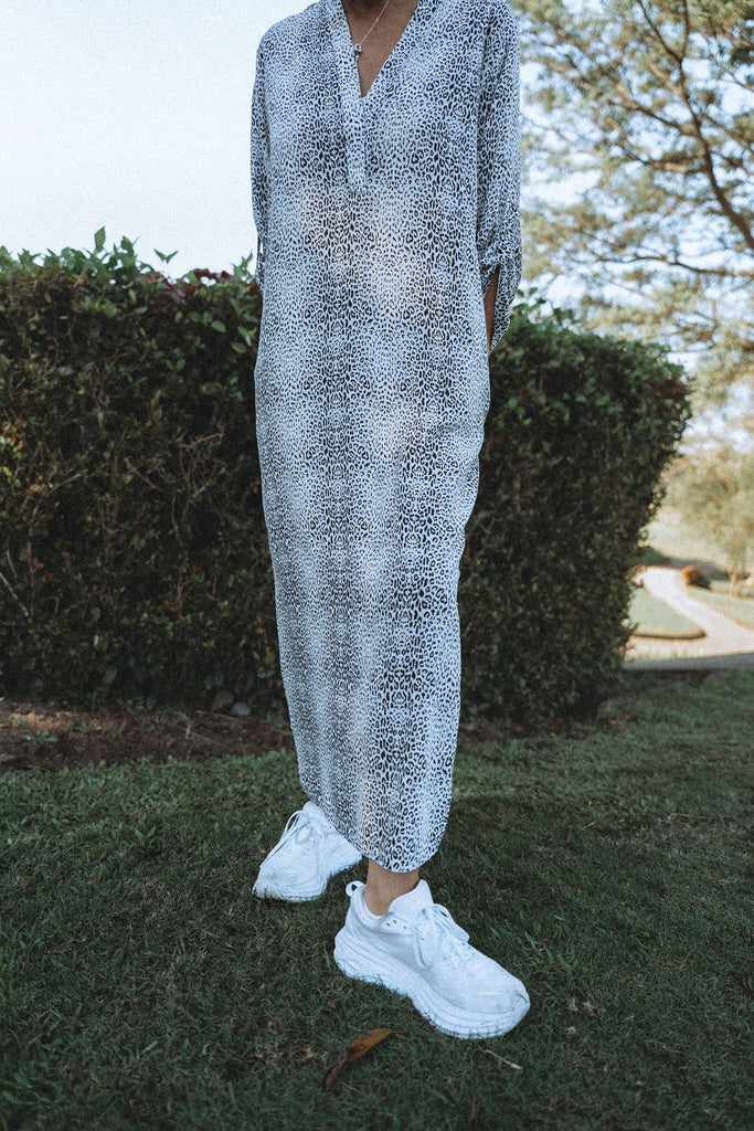 We love Flory, a shirt dress with a mandarin collar and placket, tab on the sleeve and one slit.