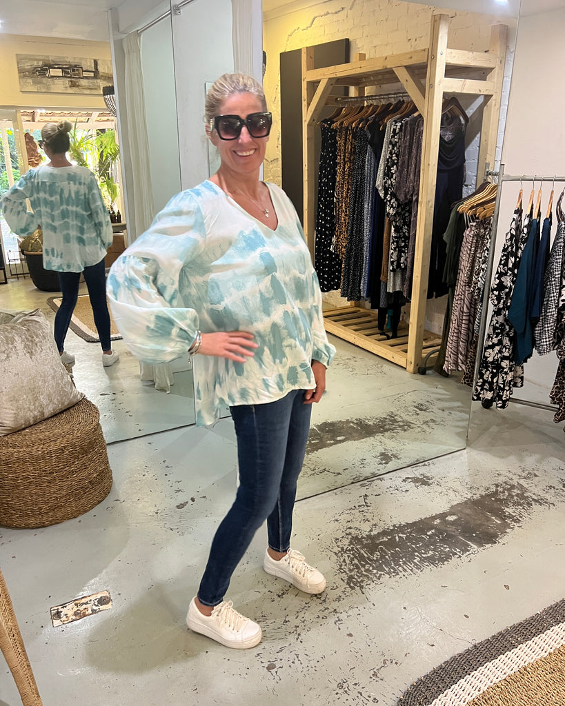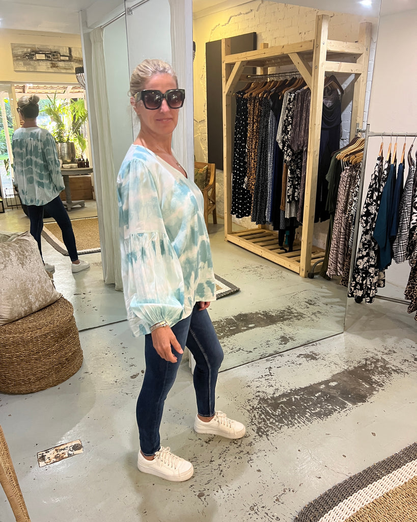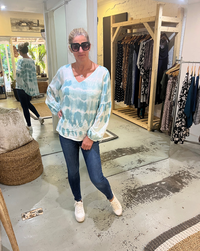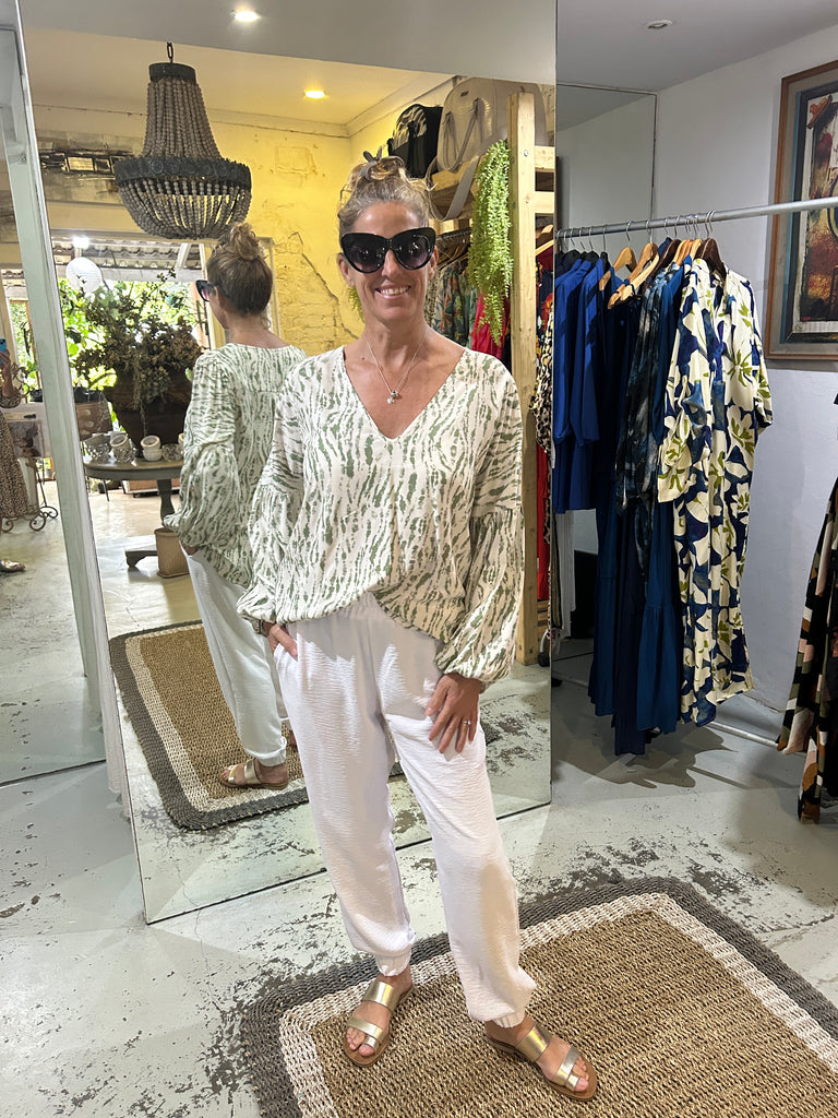 Viscose Kimbo top with ruffled elasticated sleeve and vee neck front.