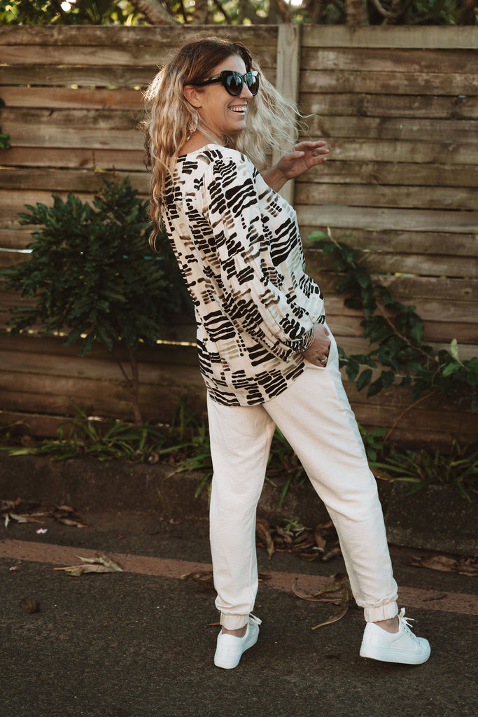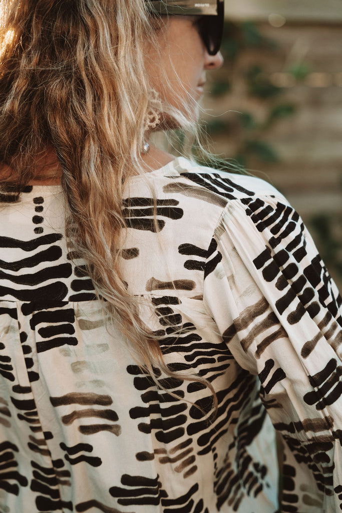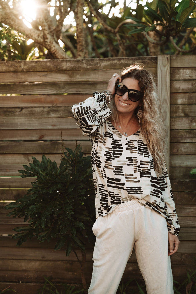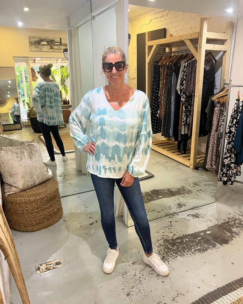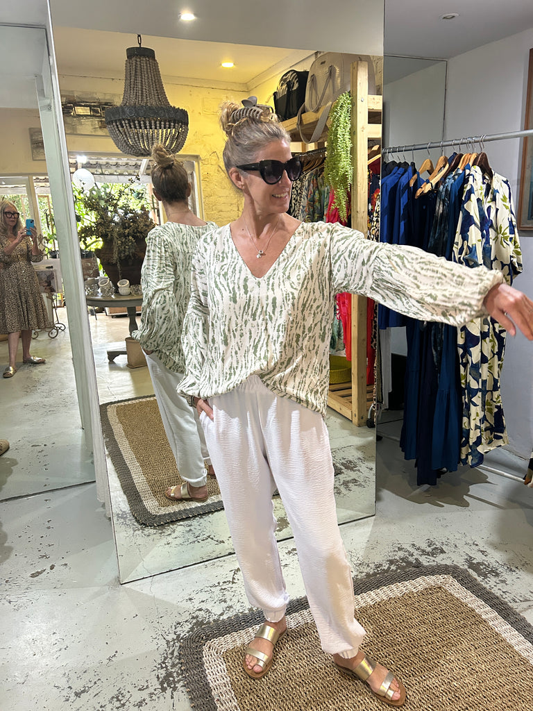 Viscose Kimbo top with ruffled elasticated sleeve and vee neck front.
