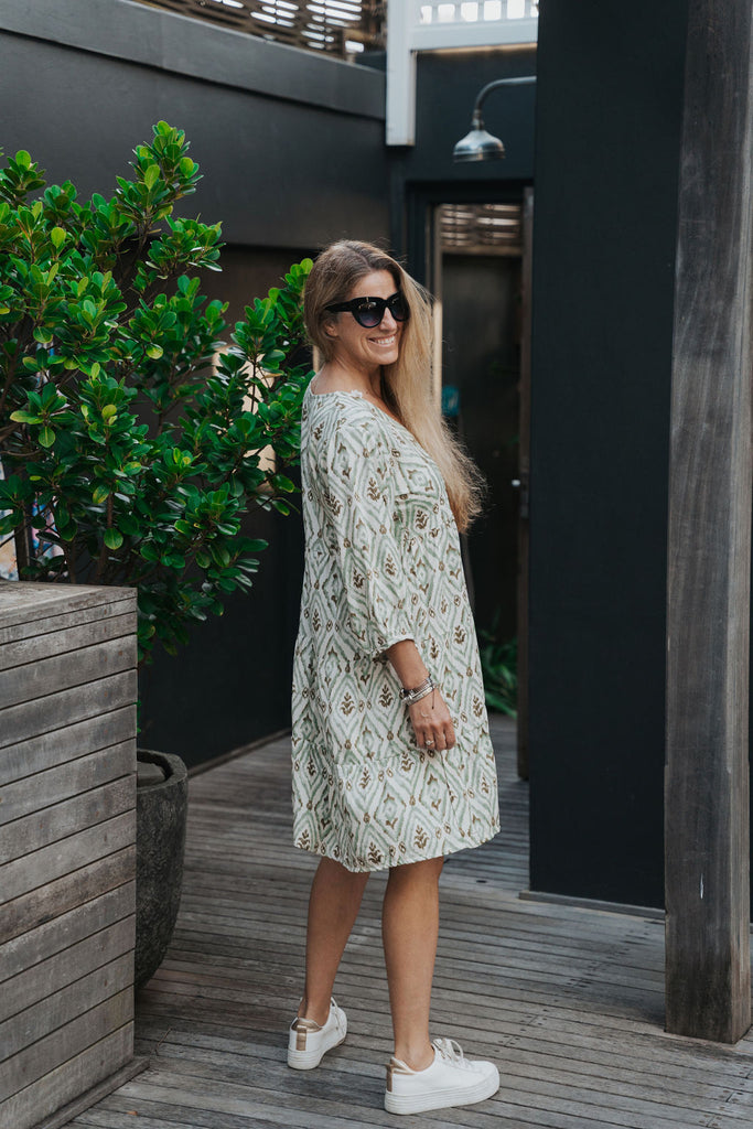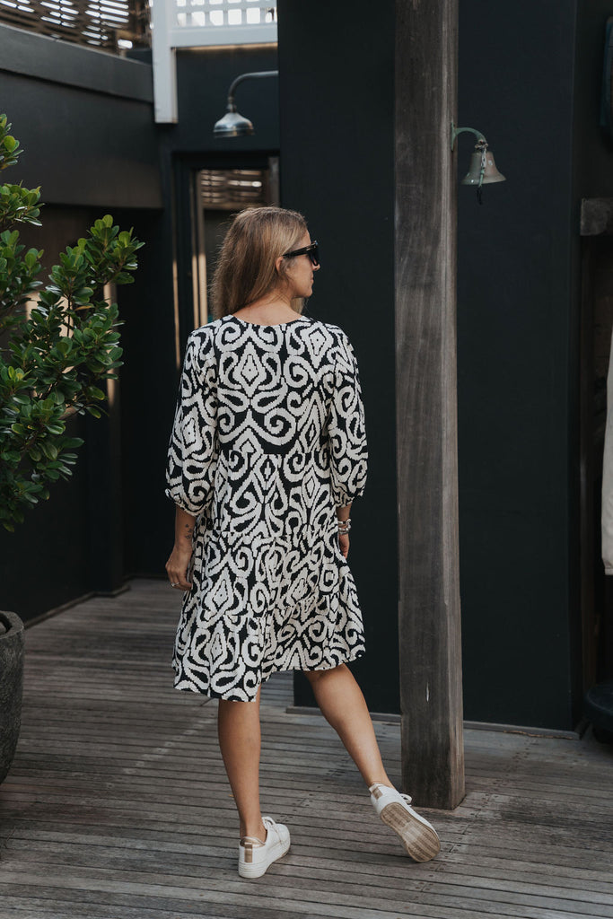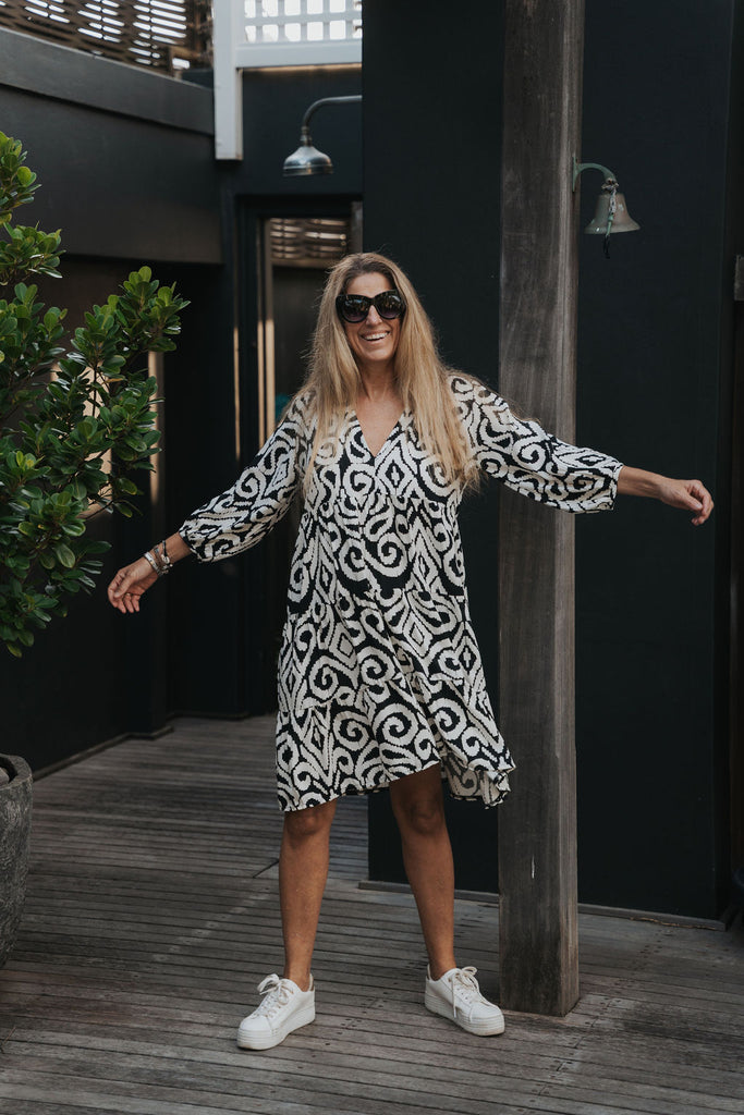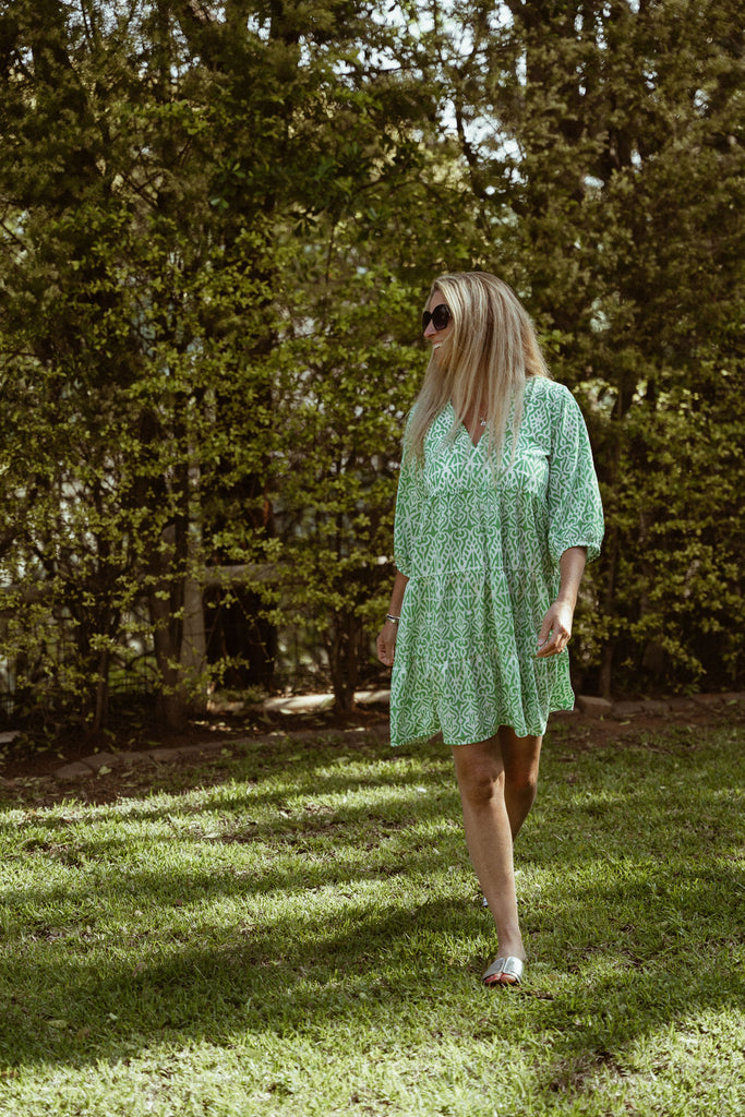 This dress is made in supersoft fabric with tiers and a cuff on the sleeve and vee neck detail.