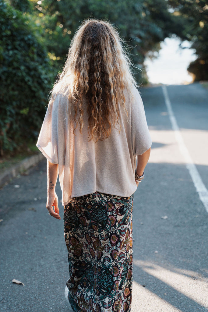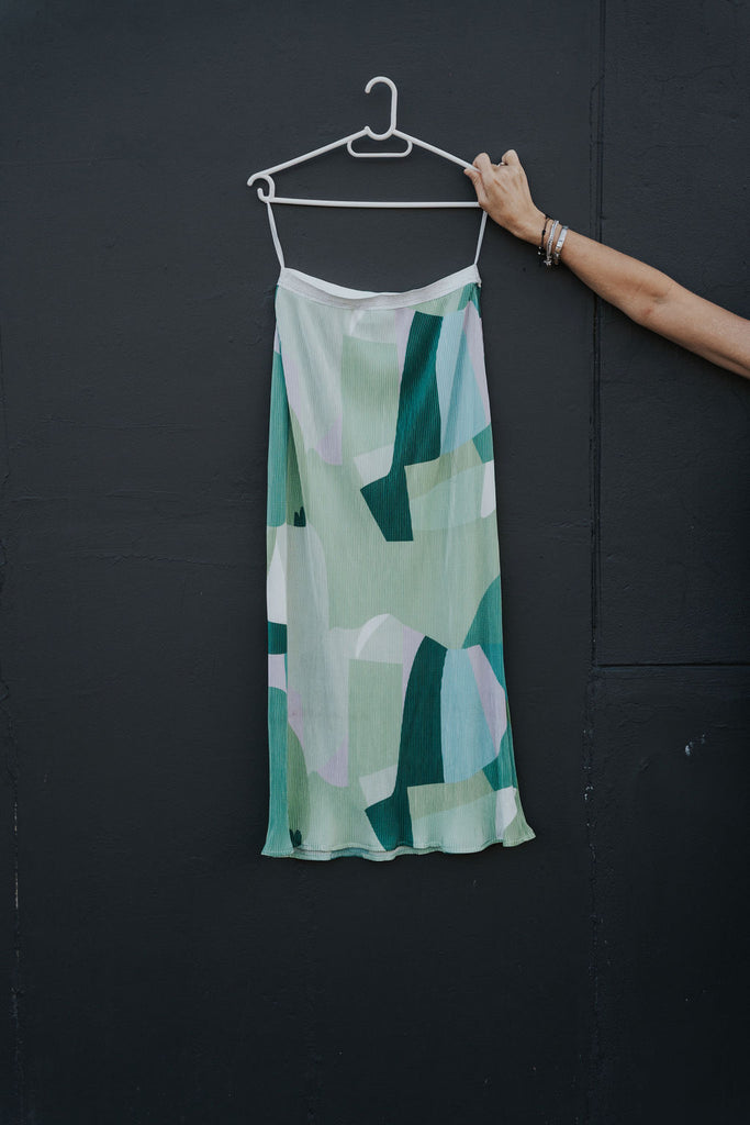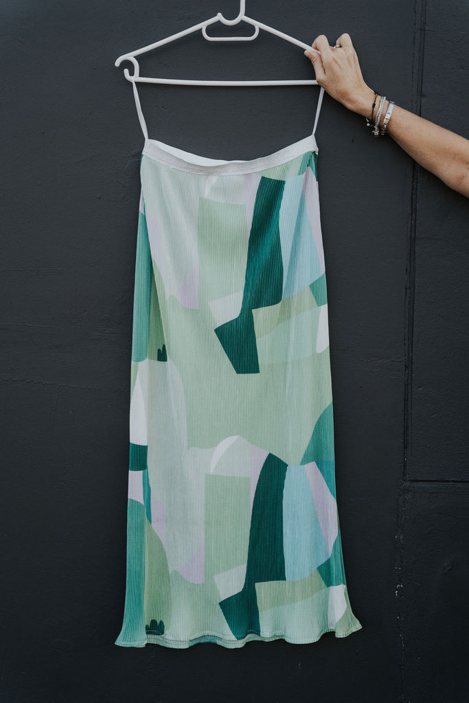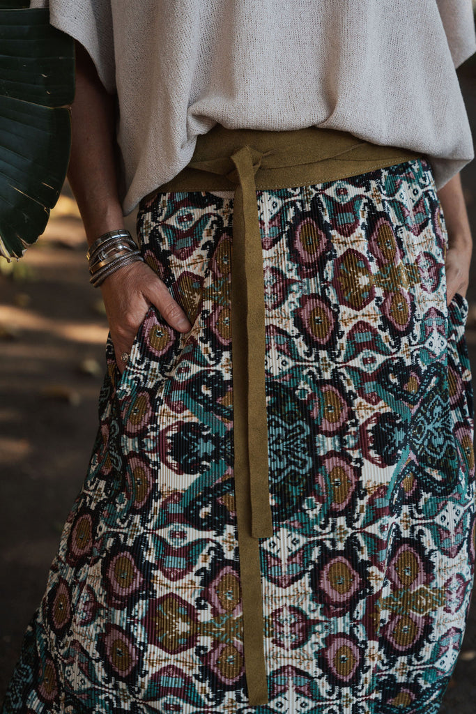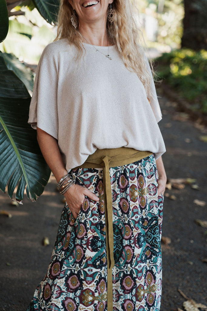 Our Stella skirt is in this beautiful pleated fabric. Thick elastic at the top and pockets. Its worn here with our Juliette knit jersey.