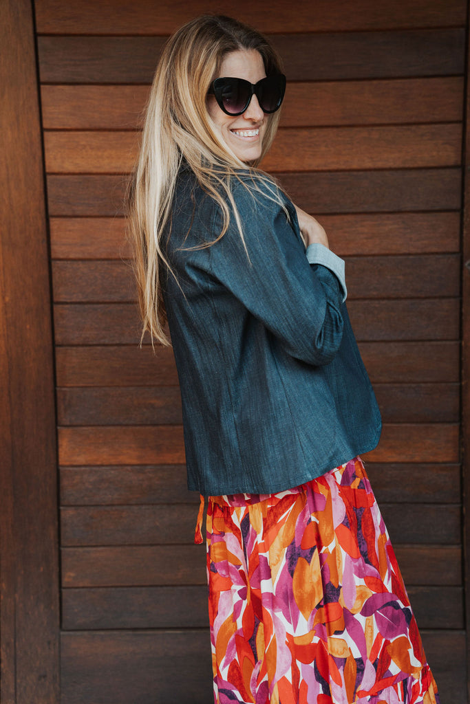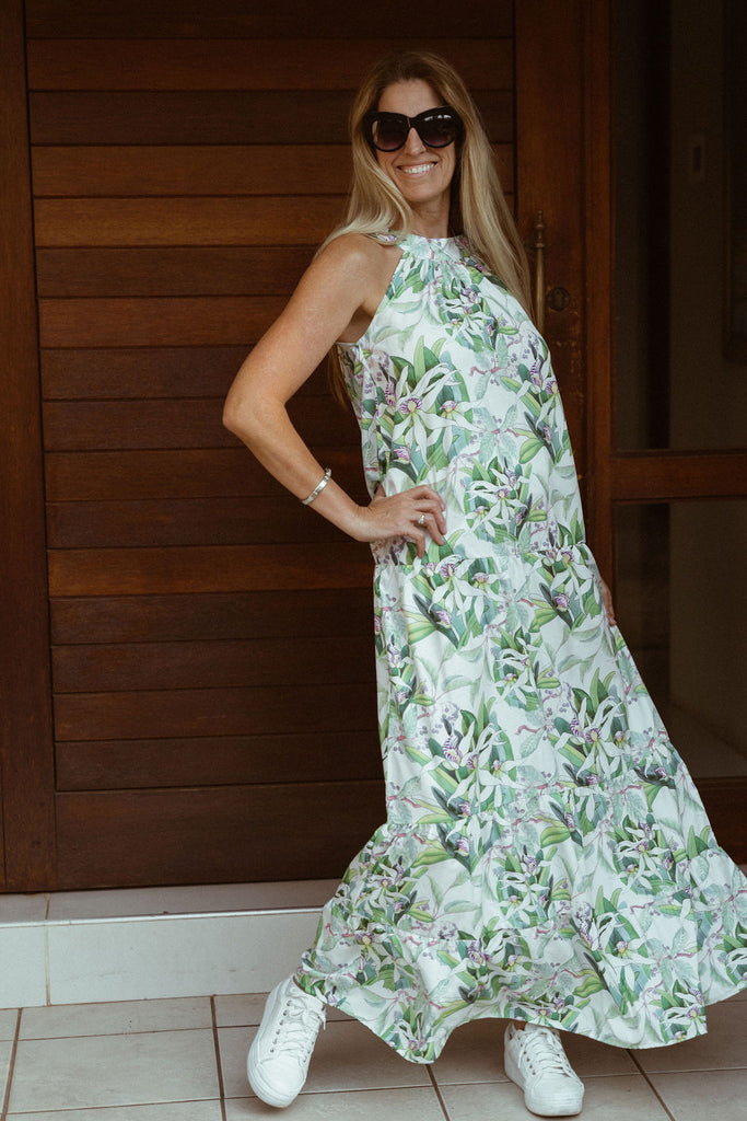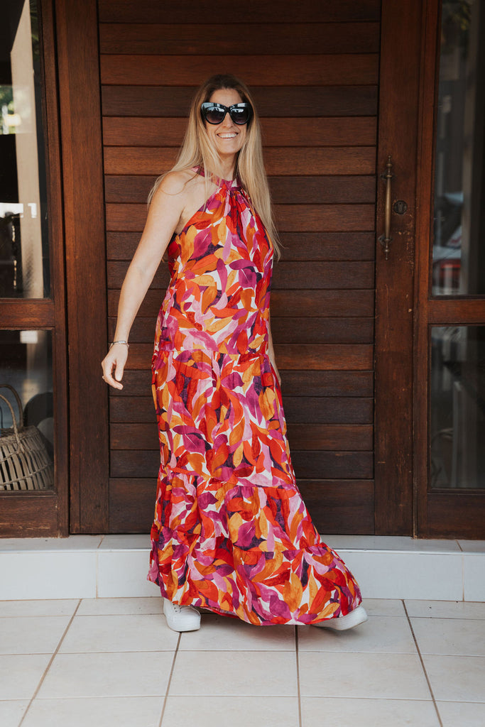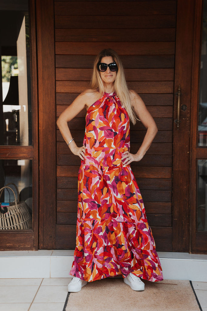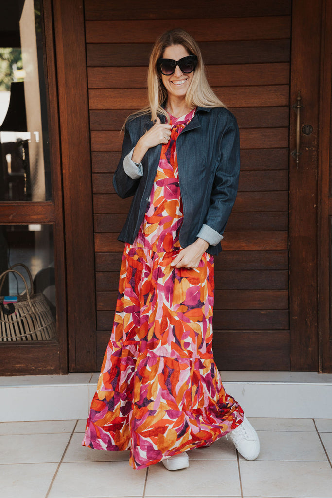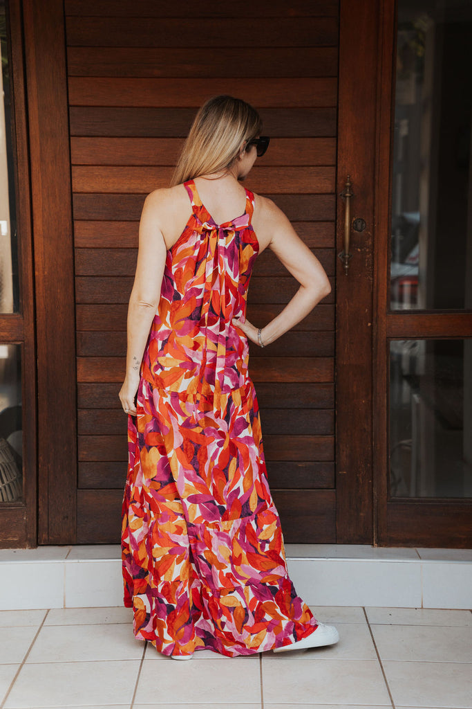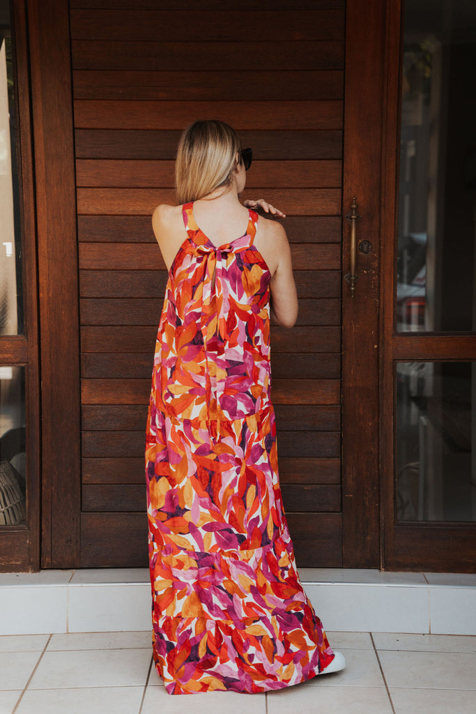 Beautiful cool viscose print in this tiered dress with tie detail.